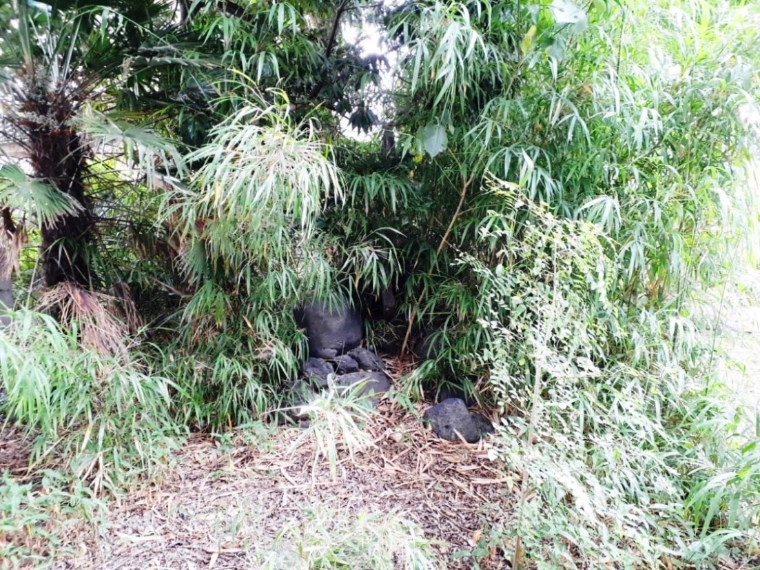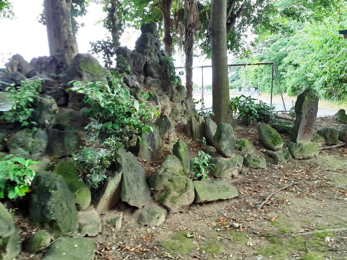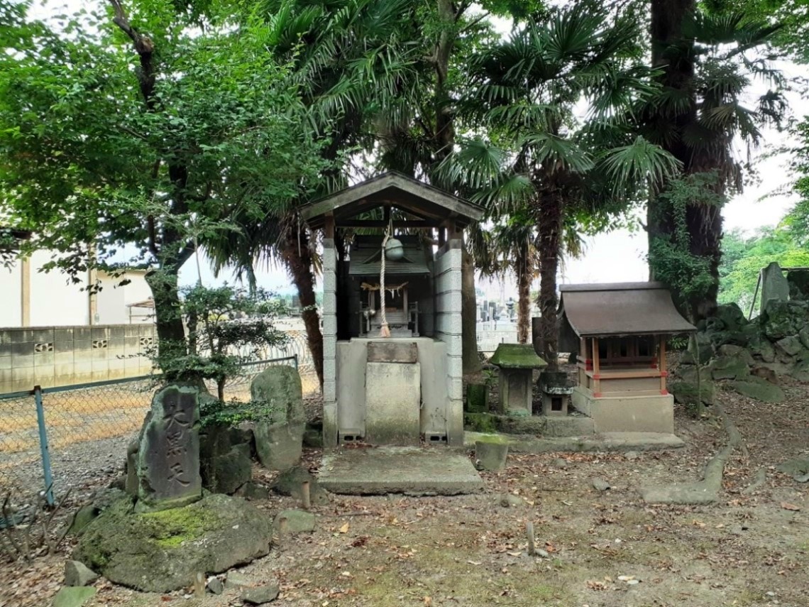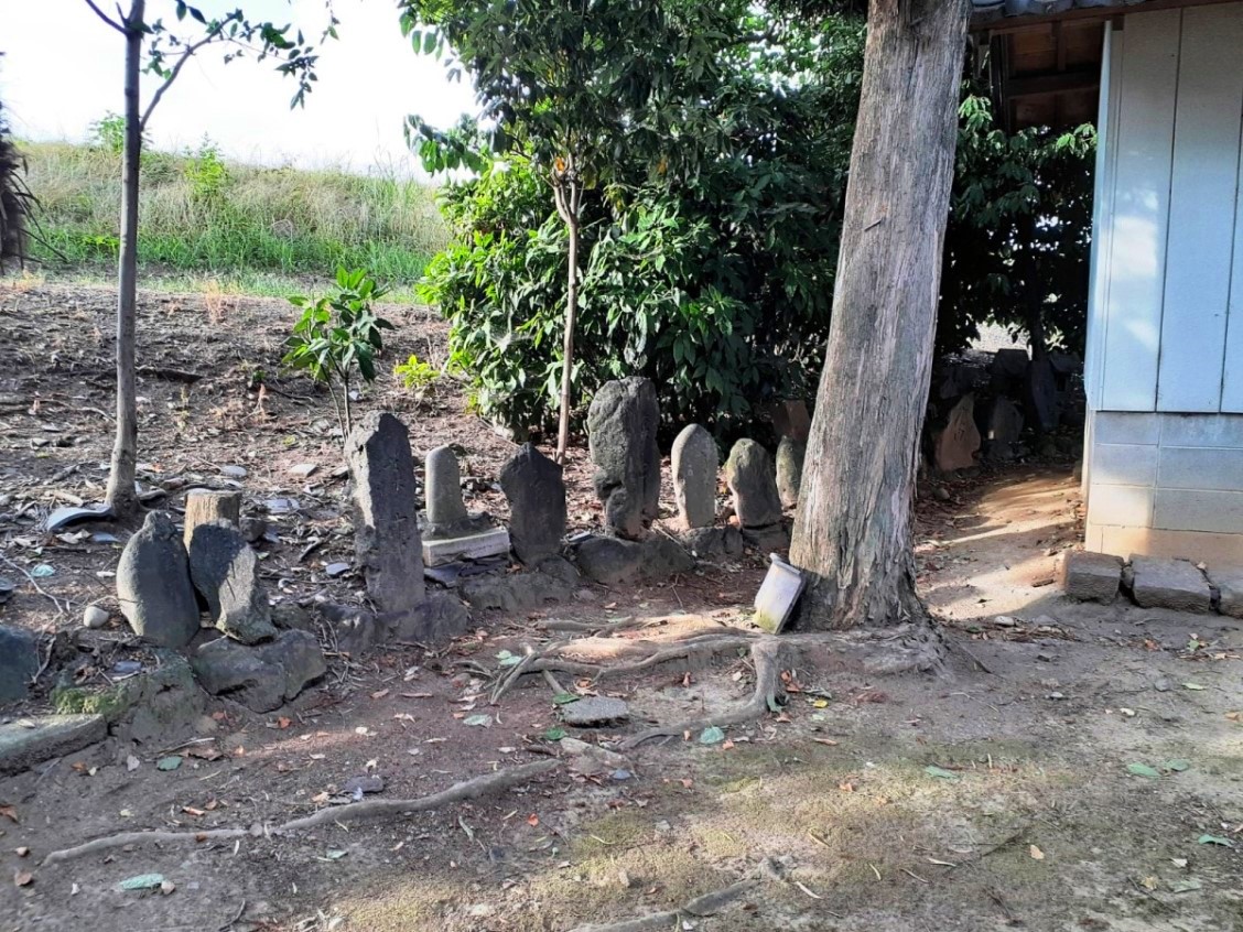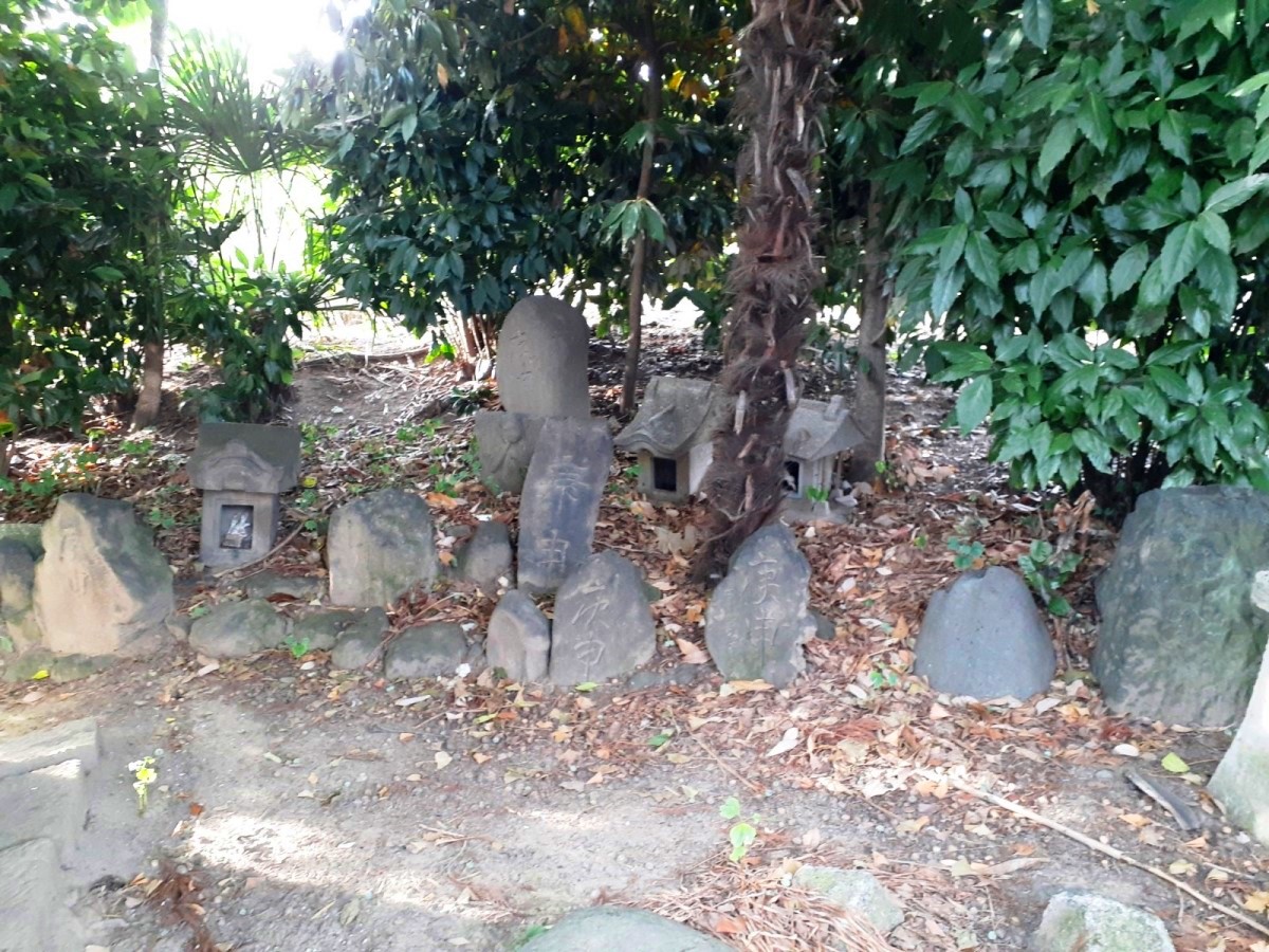 中央の石碑の左側石祠が天手長男神社、右が菜種