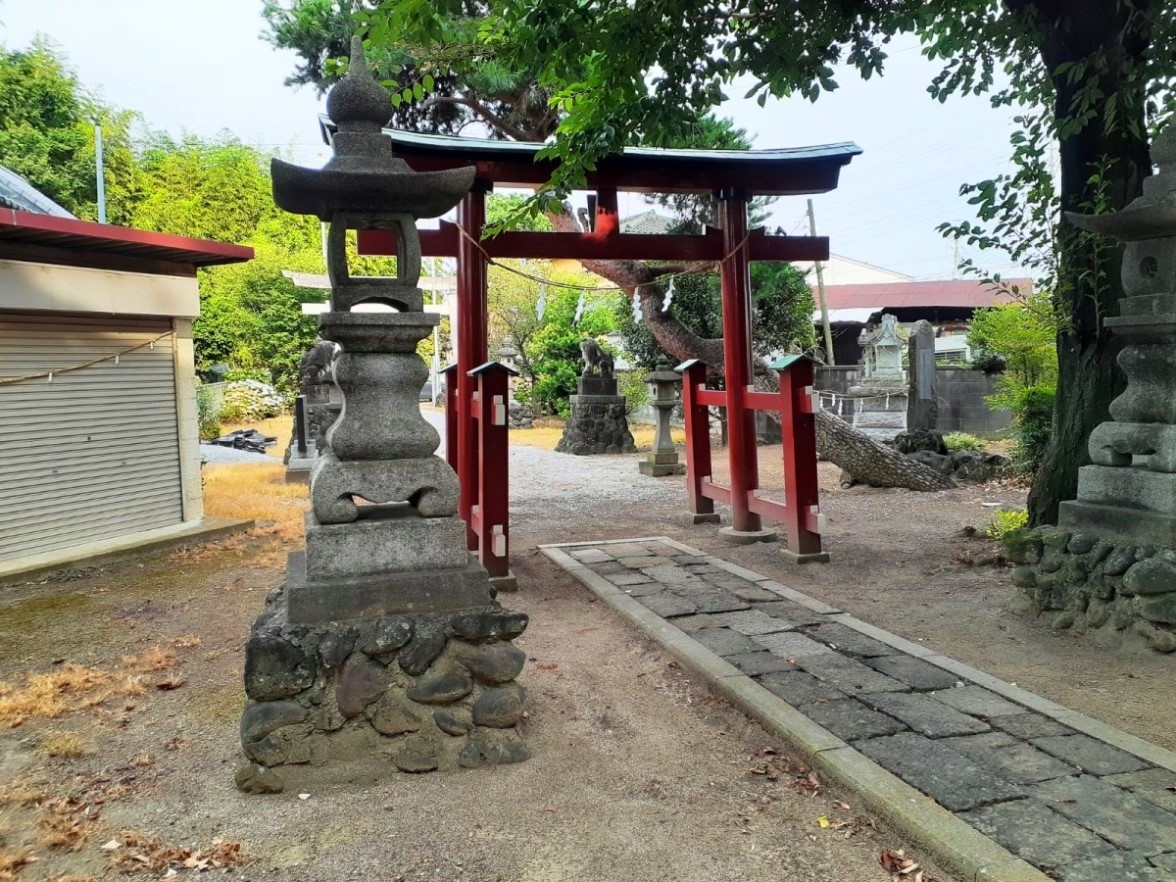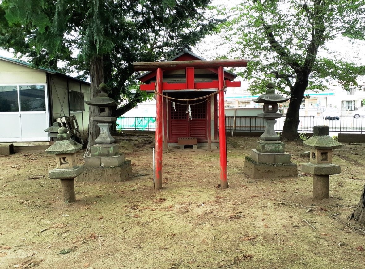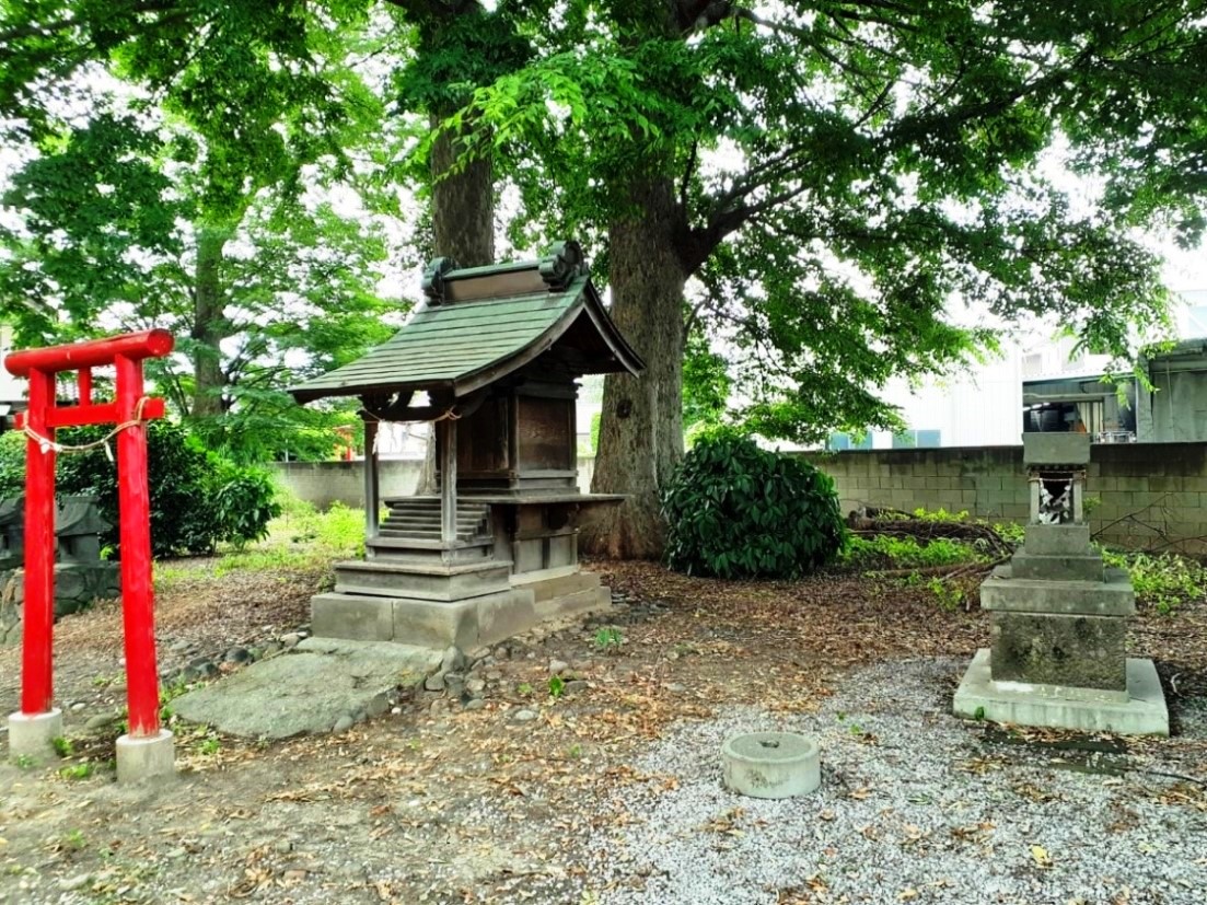 左側の赤い石祠は三峯神社。 赤い鳥居は稲荷社。隣の石祠は不明。