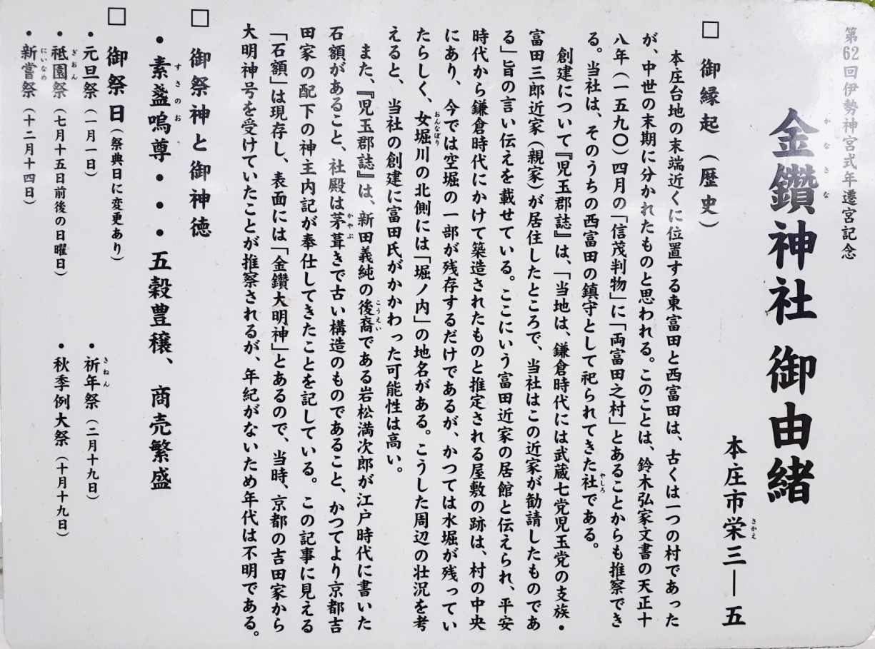 境内ハ四百七拾万坪ヲ有シ社格ハ明治五年村社トナリ明治四十二年ニ無格社雷電神社稻荷神社八幡神社諏訪神社ヲ境内社ニ移轉シ大正十年二月二日神饌幣帛料指定社トナル神域ノ樹木欝蒼トシテ神威赫々タリ茲ニ由来ヲ調査シテ略記シ後世ニ傳フト云爾