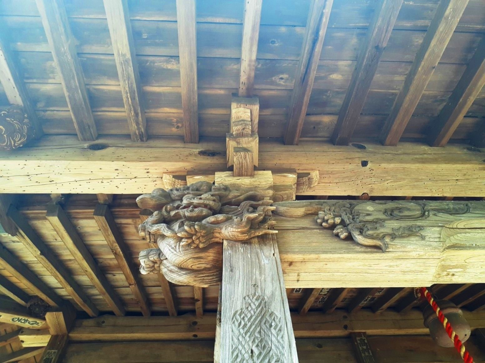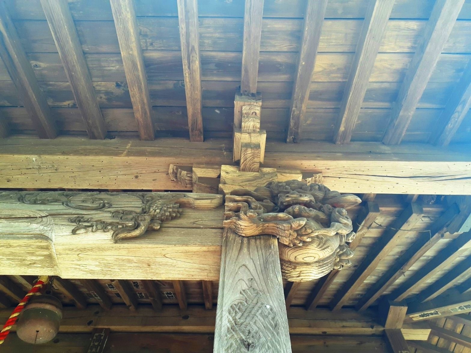 拝殿向拝部(写真上)、木鼻部位(写真下左・右)の彫刻が素晴らしい。