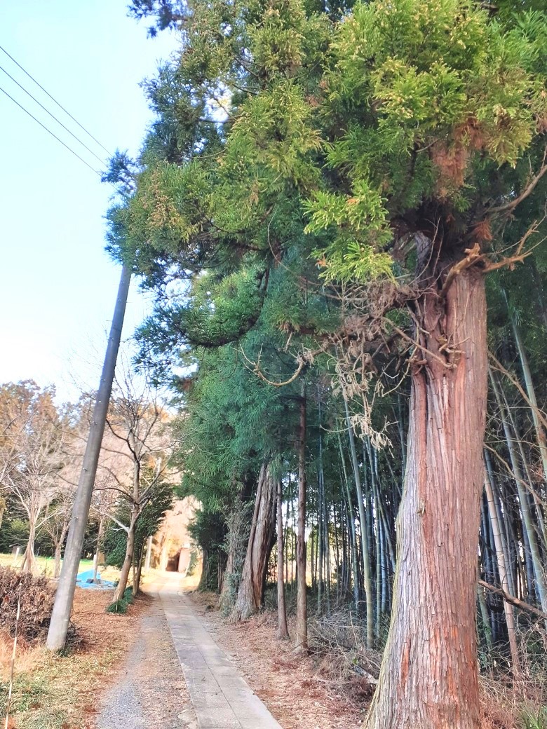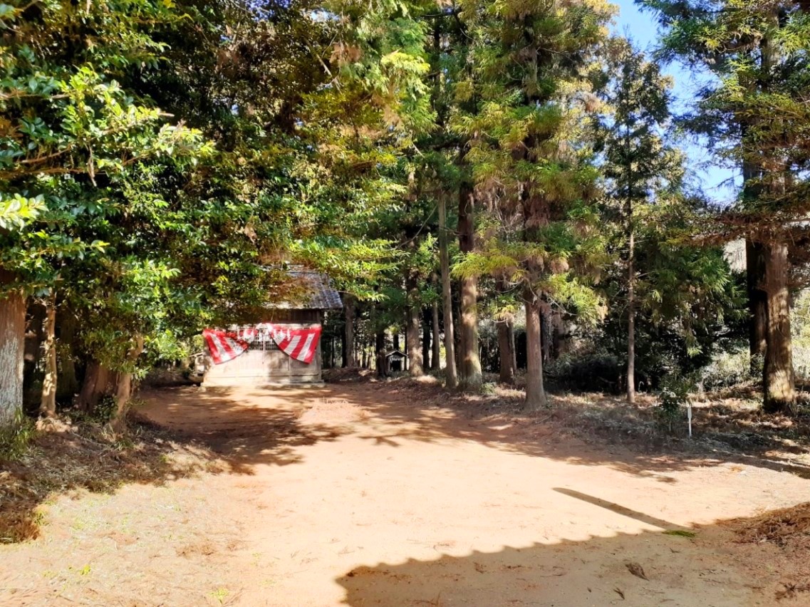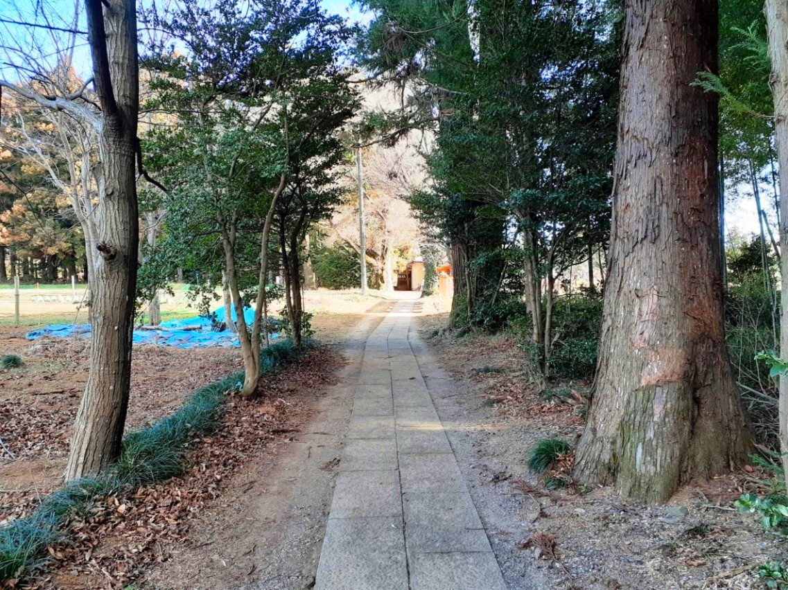 参道がほぼ東側に伸びていて(写真左)、参道の先には将軍沢農村センターが見える(同右)。そして農村センターの左隣には、境内社・将軍神社が鎮座している。