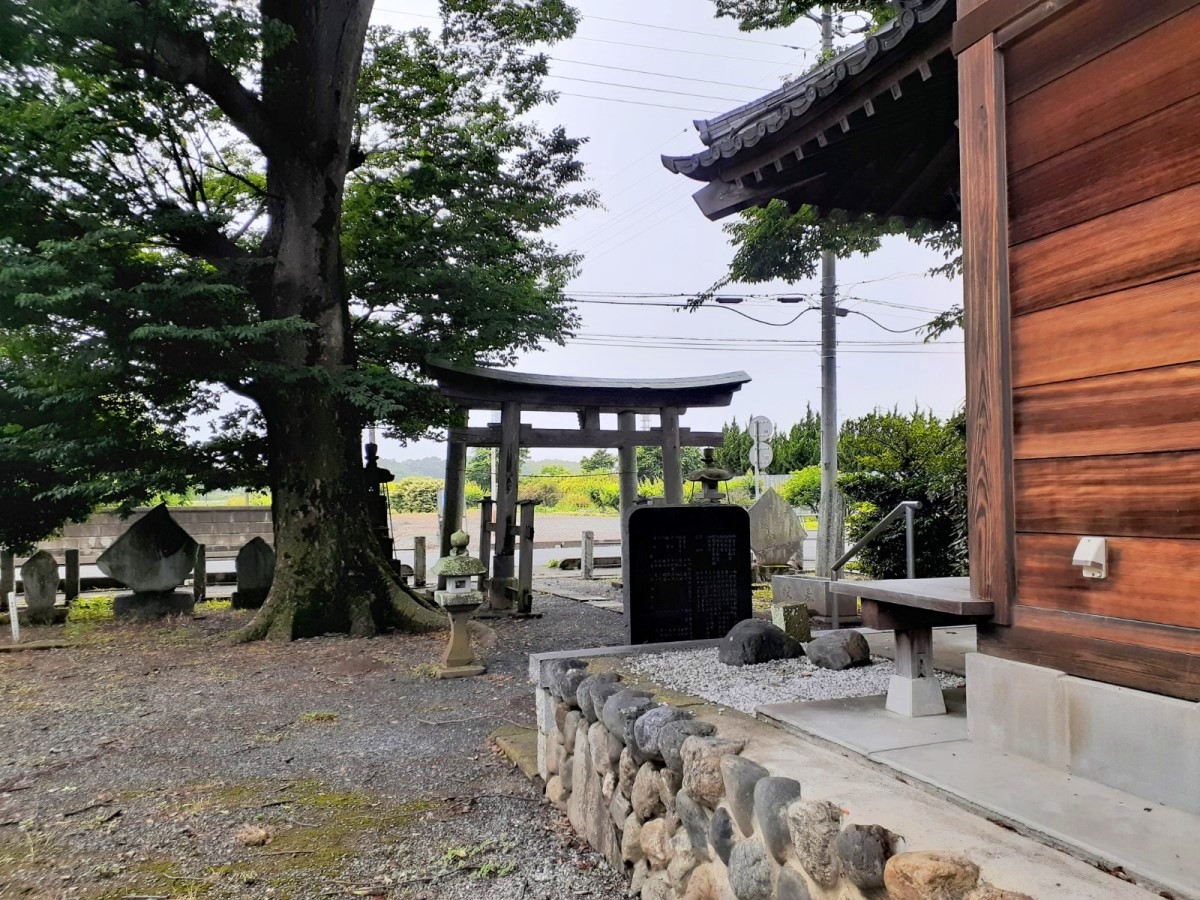 深谷市西田地区に鎮守する。この地域は小山川と志戸川の合流地点の右岸に近接した位置にあたり、嘗ては河川の乱流地域であったことが、この鳥居の低さ、また基礎部分が頑丈なコンクリートブロックを2段重ねにしている所からも見て取れる。