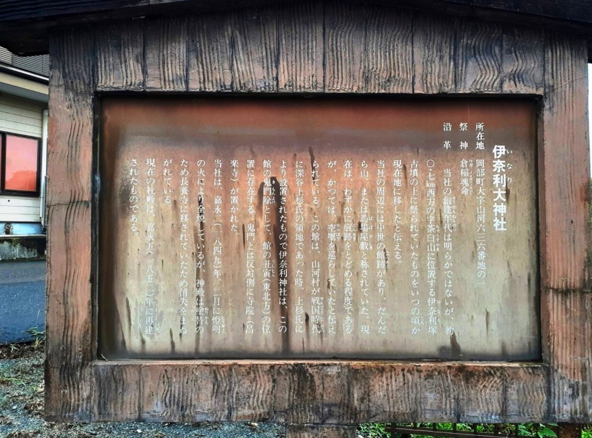 当社の周辺には中世の館跡があり、だんだら山、または馬場屋敷と称されていた。現在は、わずかに痕跡をとどめる程度であるが、かつては、空堀を巡らしていたと伝えられている。この館は、山河村が戦国時代に深谷上杉氏の領地であった時、上杉氏により設置されたもので伊奈利神社は、この館の鬼門除として、館の丑寅(東北方)の位置に存在する。鬼門とは反対側に寺院(昌楽寺)が置かれた。