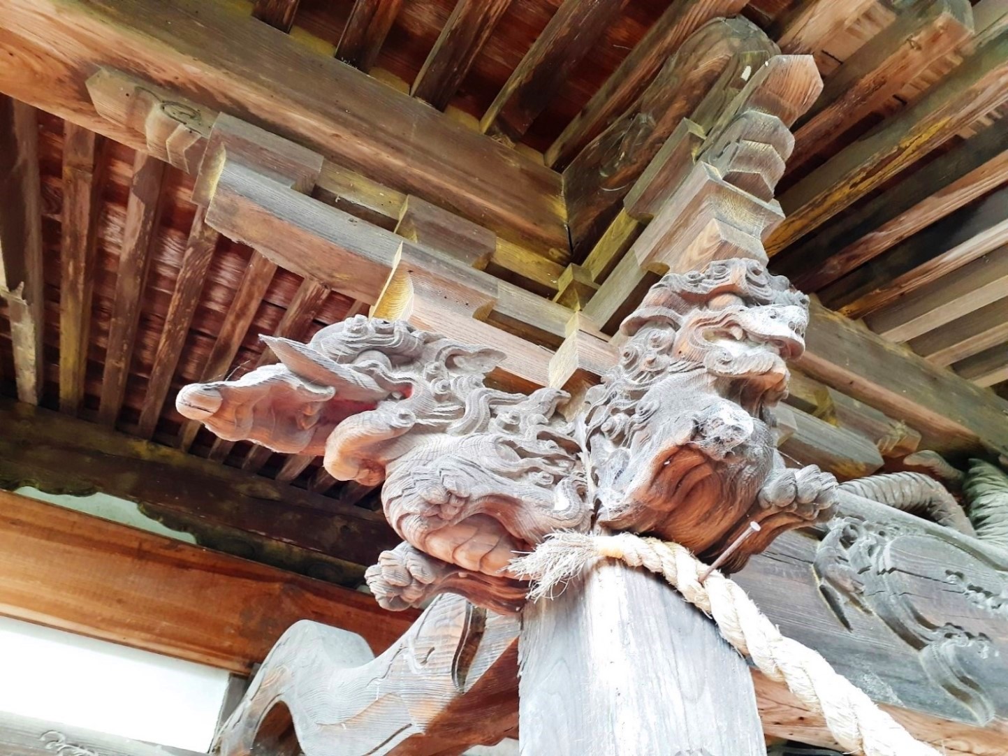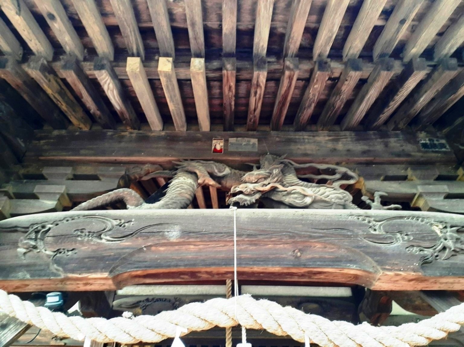 拝殿の所々には見事な彫刻が施されている(写真左・右)更に極彩色豊かな素晴らしい本殿もあるという。案内板によれば、嘉永二年の火災の時には、偶々塗り替えの為に隣の長養寺に移されていて、焼失を逃れたそうだ。