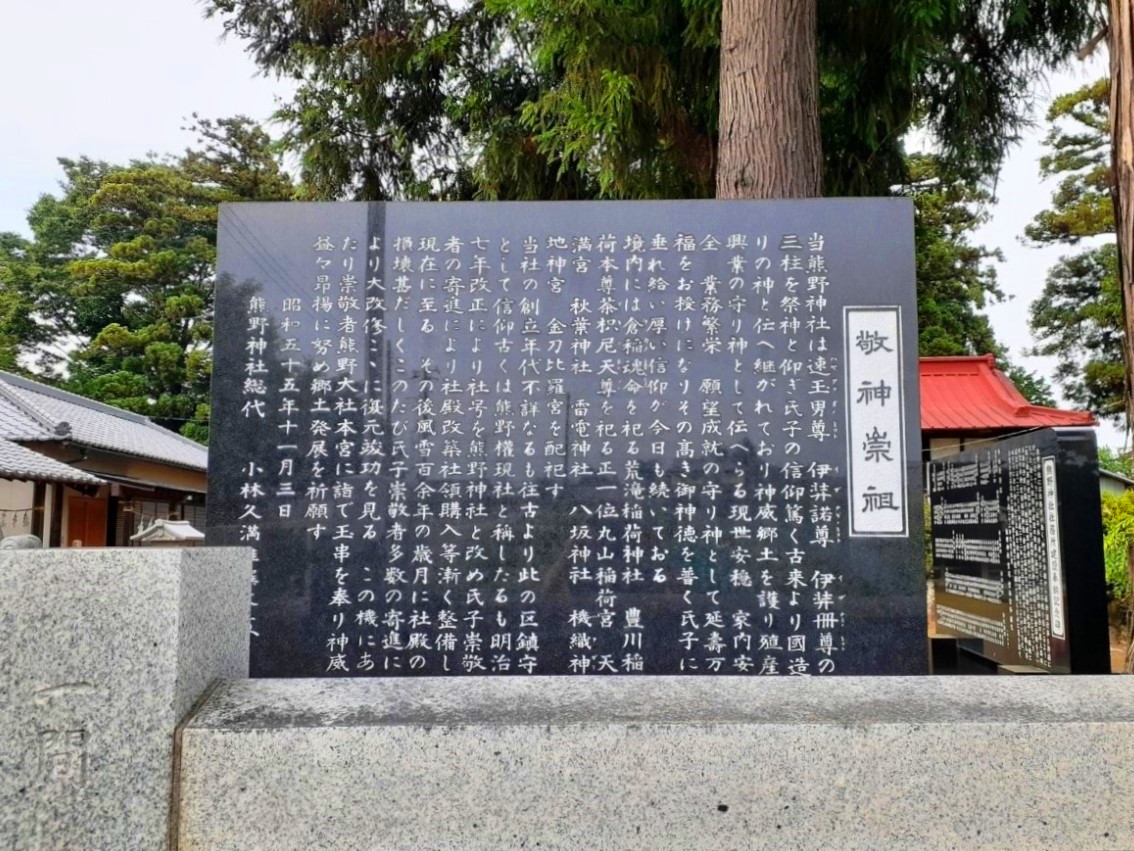 当社の創立年代不詳なるも往古より此の区鎮守として信仰古くは熊野権現社と称したるも明治七年改正により社号を熊野神社と改め氏子崇敬者の寄進により社殿改築社領購入等漸く整備し現在に至る。その後風雪百余年の歳月に社殿の損壊甚だしくこのたび氏子崇敬者多数の寄進により大改修ここに復元竣功を見る。この機にあたり崇敬者熊野大社本宮に詣で玉串を奉り神威益々昂揚に努め郷土発展を祈願す。