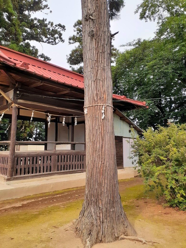 地図等でこの地域を確認すると、櫛挽台地の一角にあるこの岡白鬚神社周辺は、南北に細長いこの住宅街が西側に防風林を背負うように立ち並んでいて、冬時期において周辺が赤城おろしの強い地域であったが容易に推測される。参拝日が1月という事もあり、新緑深い生命力あふれる時期とは違い、寒さや強風を耐え忍んできた痕跡が、樹木の肌の至る所に見える。