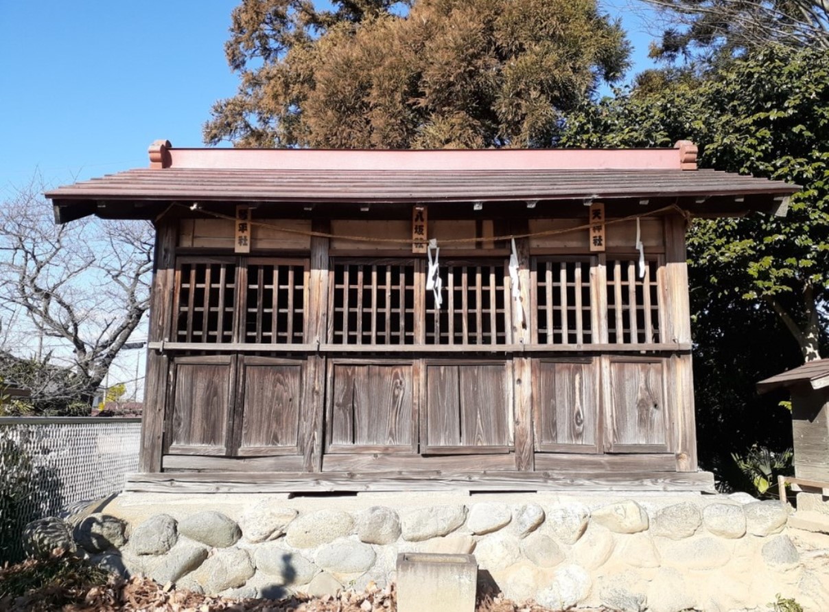 当社は、『児玉郡誌』によれば、浅見実高が奥州征伐の帰陣の際、鶴岡八幡宮を当地に勧請して産土神としたという。当社は、館跡から見て南東で、館に続く街道沿いの小高い丘の上に鎮座することから、館を見渡せる場所を選んで、館の守護神として祀ったのであろう。