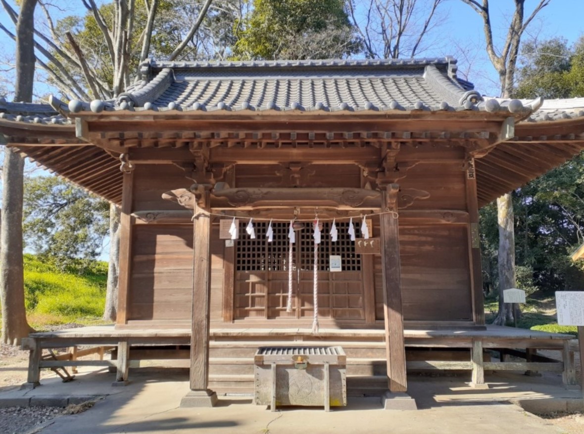 古塚の上に鎮座す、塚の高一丈餘ばかり、六七間にて横に長し、社に向て左の方に長九尺、幅五尺餘の石片面あらはれてあり、昔村民此石を堀出さんとなせしかば、忽ち祟りを蒙むりしとて、其後は恐れて手を觸る者なしと云、按に此塚は古代墳墓にして、顯れし石は全く石㨯と見えたり、おもふに下總國那須郡國造塚の類にして、郡司などいふものゝ葬地なるべし、又近郷箕田村の古塚も是と同じ形なり、