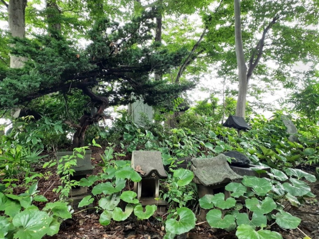 末社臺天白神社は小児の百日咳に霊験ありとて篠笛を納め来る賽客多し。