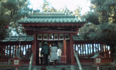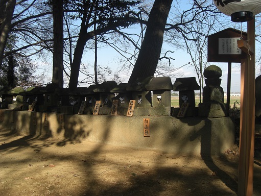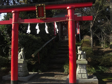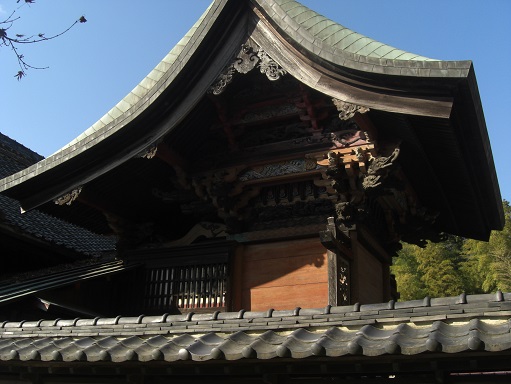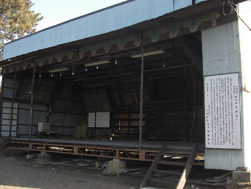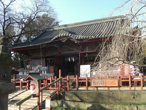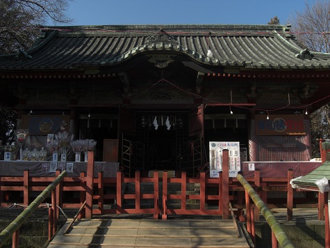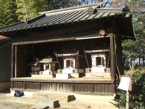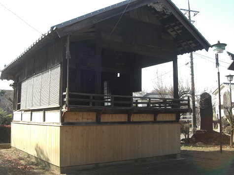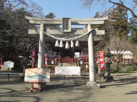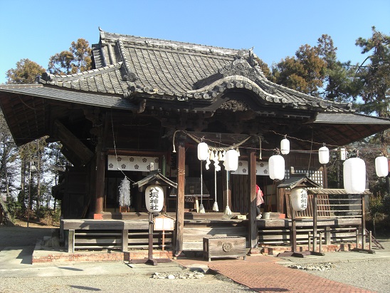 室町時代の天文16年(1547)、飯野城主(いいのじょうしゅ)篠崎三河守(しのざきみかわのかみ)が造営。全国に7か所あるのみの二間社入母屋造(にけんしゃいりもやづくり)。真横から見る屋根の曲線美が見事で、群馬県内に現存する最古の神社建築だそうだ。祭神は八幡大神(やはたのおおかみ)・稲荷大神(いなりのおおかみ)の2柱。
