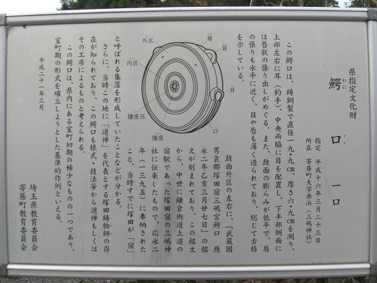一の鳥居や社号標の右側で道路沿いに寄居町指定天然記念物である「塚田三嶋神社のヤブツバキ」、そして埼玉県指定文化財の「鰐口」の案内板が掲示されている。