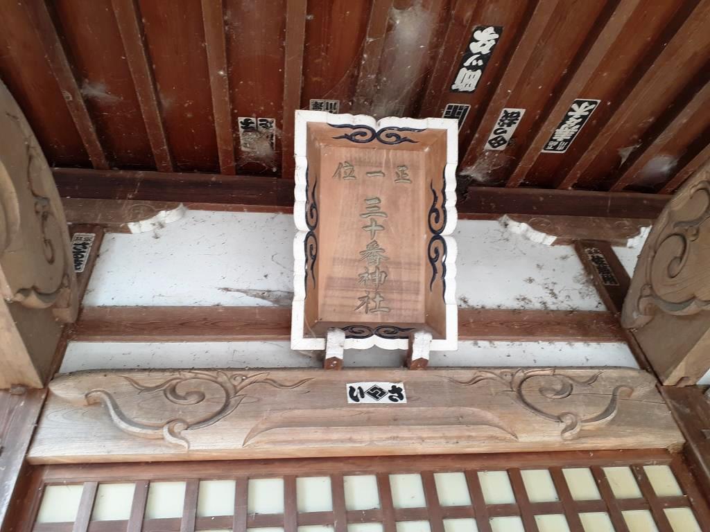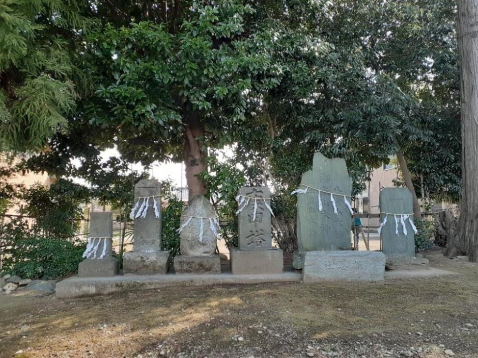 一番右側に祀られている「白幡大神」は『増補忍名所図会 巻三 城東』に「白旗明神」として紹介されていて、天文年中(1532〜1555)に上杉謙信が上野国より攻撃して来た時、ここで軍勢を揃えた。そのため今はその場所を馬揃(ばそろい)と呼んでいる。それからこの場所に白旗一流(ひとながれ)を取り落したのを、土地の人が拾いこれを石櫃(せきひつ)に入れ土の中に埋め杉の木を植えた。今でも白旗明神と崇(あがめ)祭られるが杉樹ばかりで神祠はない、と説明されている。