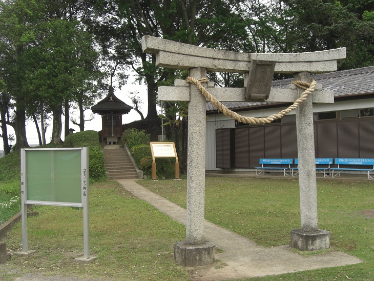 鳥居の奥に石段があり、その右側には白山古墳の案内板がある。
