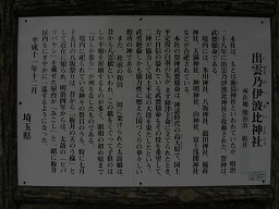 ところで出雲乃伊波比神社が鎮座するあたりの小字名は「氷川」という。氷川といえば、さいたま市大宮区に鎮座している武蔵国一の宮氷川神社が思い付く。大宮氷川神社の祭神はスサノオノミコト、イナダヒメノミコト、オオナムチノミコトという出雲系の神様。この三柱の神様をお守りする神主家は明治になるまで三家(岩井家、東角井家、西角井家)で、スサノオの奉齋を担当していたのは岩井家であった。「氷川神社の周辺もやはり湧水が涸れることの無い神聖な場所であったという。出雲乃伊波比神社の創建年代は氷川神社より古いのではないか、また出雲系の神々は、出雲~越国~信州~関東という具合に、日本海方面から来たのではないか、と想像を膨らましてしまう。