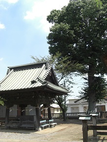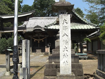 本殿の左側には境内社 稲荷社 明治43年大洪水の水標が拝殿前にある。