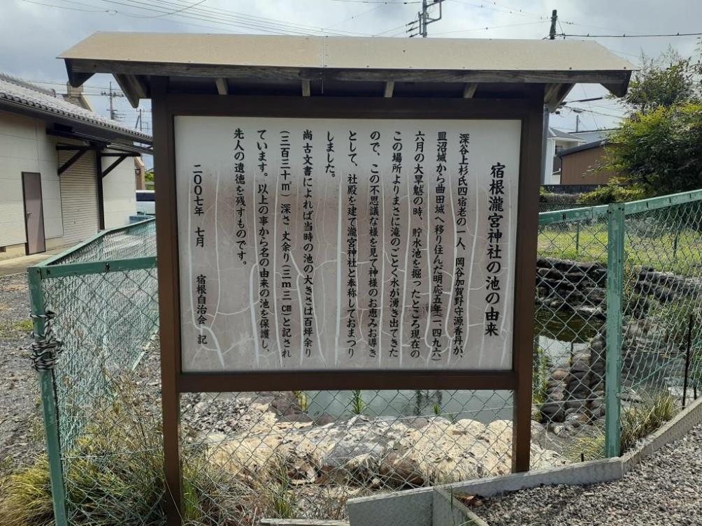 「宿根瀧宮神社の池の由来」の案内板 地域の耕地を潤した池が今でもある。