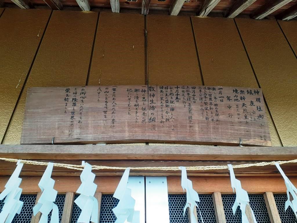 拝殿正面には、当社の簡単な由緒と年中行事及び「敬神生活の綱領」を記した板が掲げてある。氏子のだれかが奉納したものではなかろうか。
