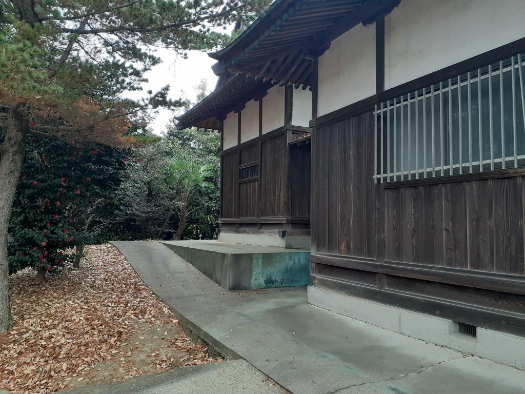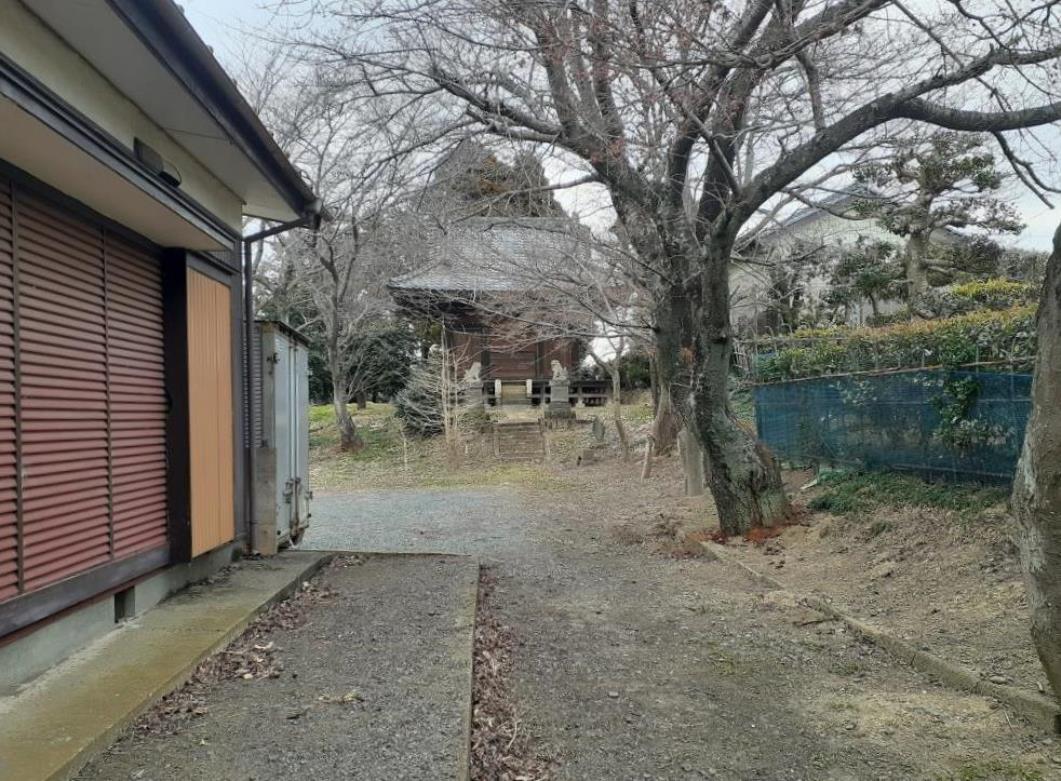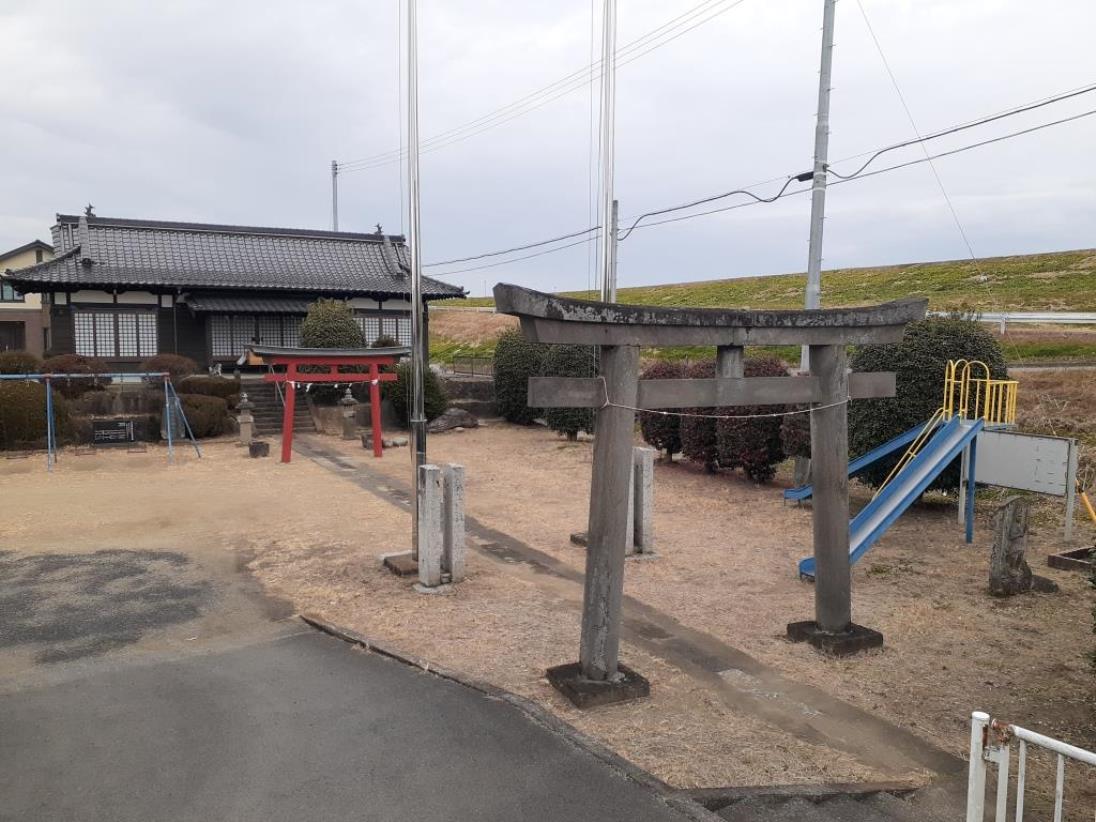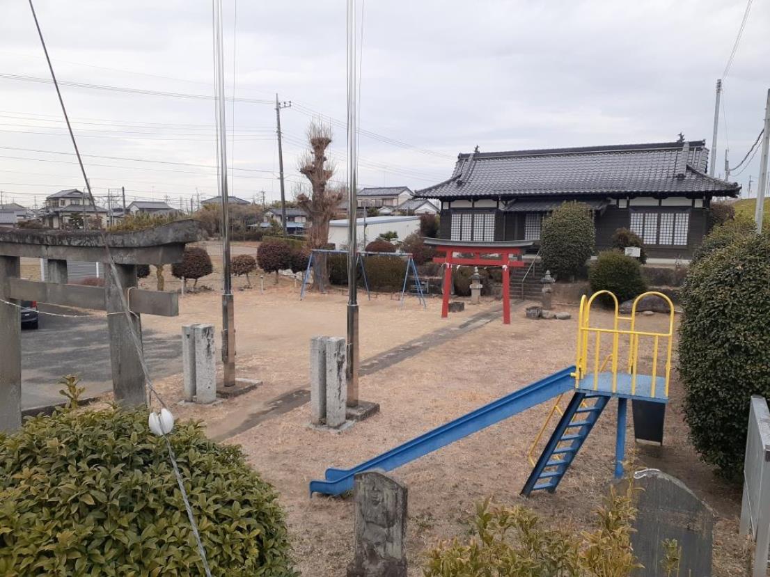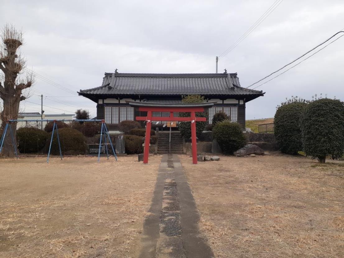参道の先に拝殿が見える。左側の建物は上柏戸集会所