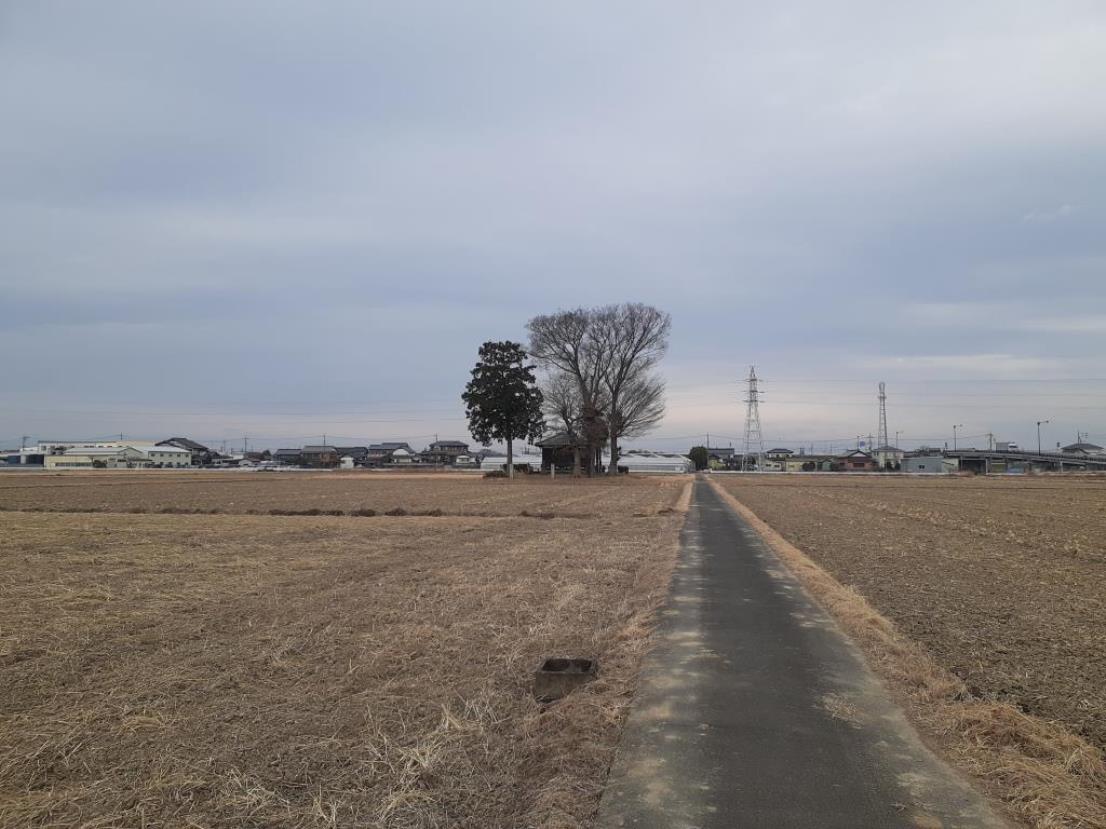 柏戸出流神社から直線距離にして700m程南東方向に柏戸八幡宮は位置していて、南北に通る埼玉県道46号加須北川辺線のすぐ西側の田畑地域の中、車幅が車両一台しか通れない農道沿いにポツンと鎮座している。