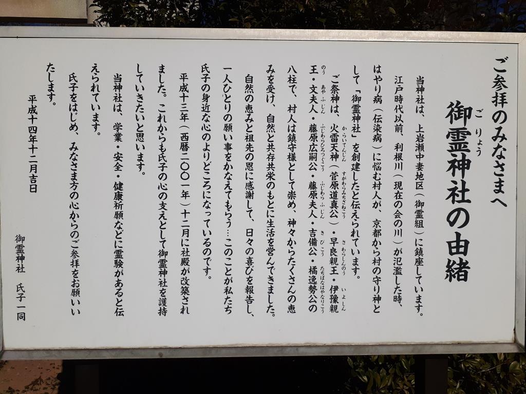 口碑によると「往古、利根川が氾濫した折、当村に、はやり病が起こり多くの村人が倒れた。医薬も乏しいころのため、回復する者も少なく村は疲弊した。村人はこの困窮から逃れんがために相計り、京都より村の守り神として御霊神社を勧請した」と伝える。