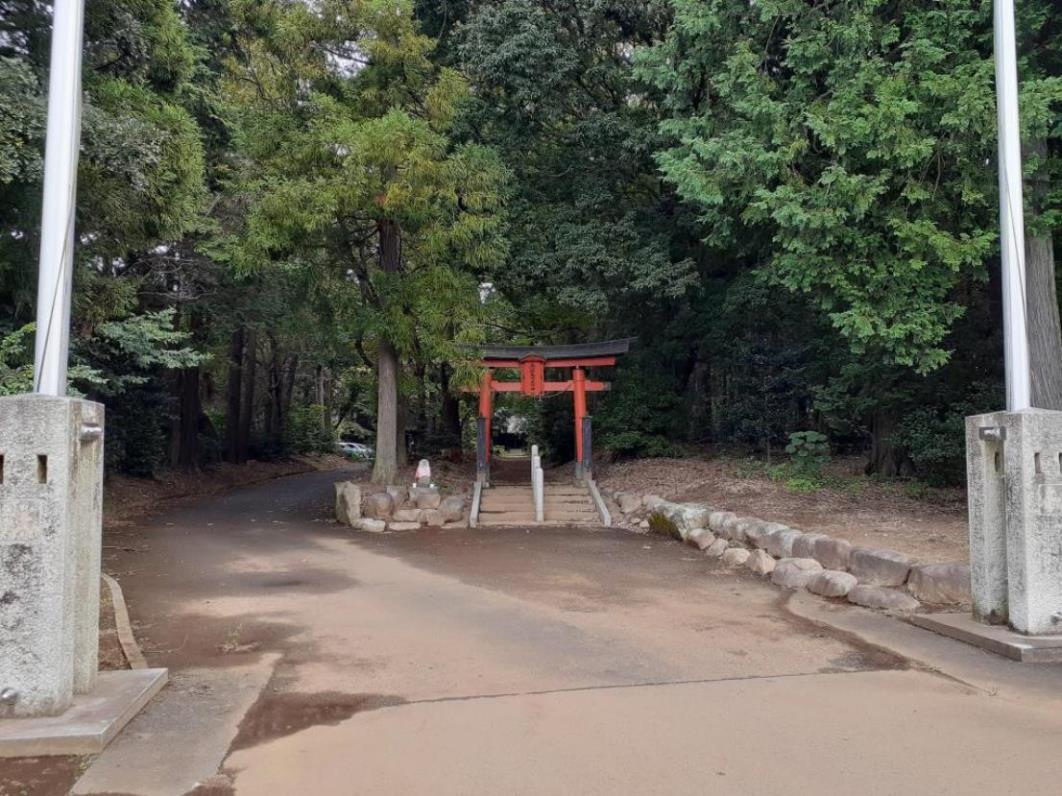 本来ならば、上記の丁字路を直進し、県道を200m程先まで進んだそのすぐ右手の道幅の細い路地を直進すれば社の正面に達するのだが、周辺には適当な駐車スペースが見当たらなかった為、社の後ろ側に達するルート説明をした次第である。