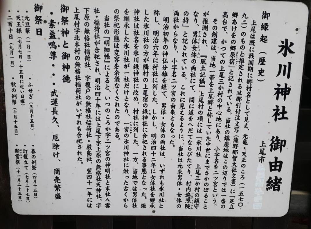 それに対して、上尾市の二ツ宮の氷川神社は、江戸時代には上尾宿・上尾下村を含めた3村の鎮守で、氷川男体(なんたい)社・氷川女体(にょたい)社の2つの神社から成り立っていた。現在、女体社はないが「二ツ宮」の地名はこの氷川二社からきたといわれていて、江戸時代の武蔵国で、氷川男体社と氷川女体社が併置された村は見られず、大変珍しい事例ということになる。