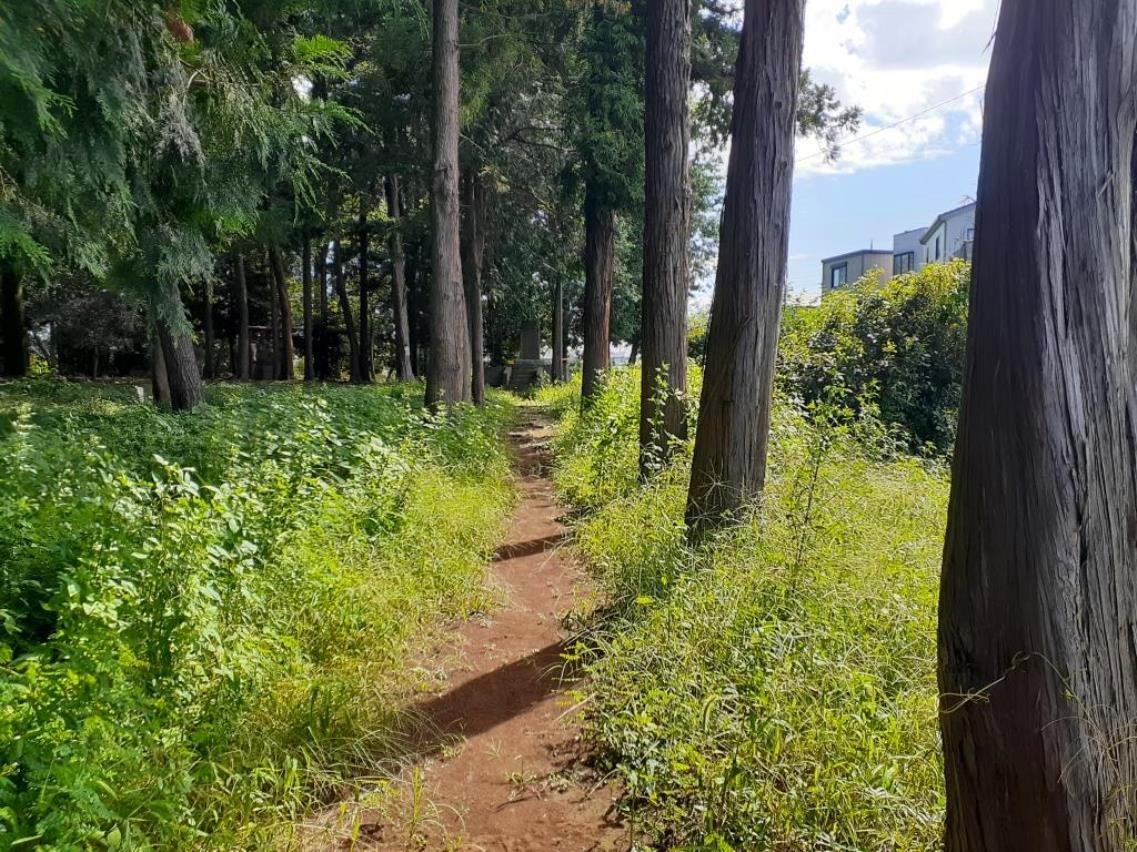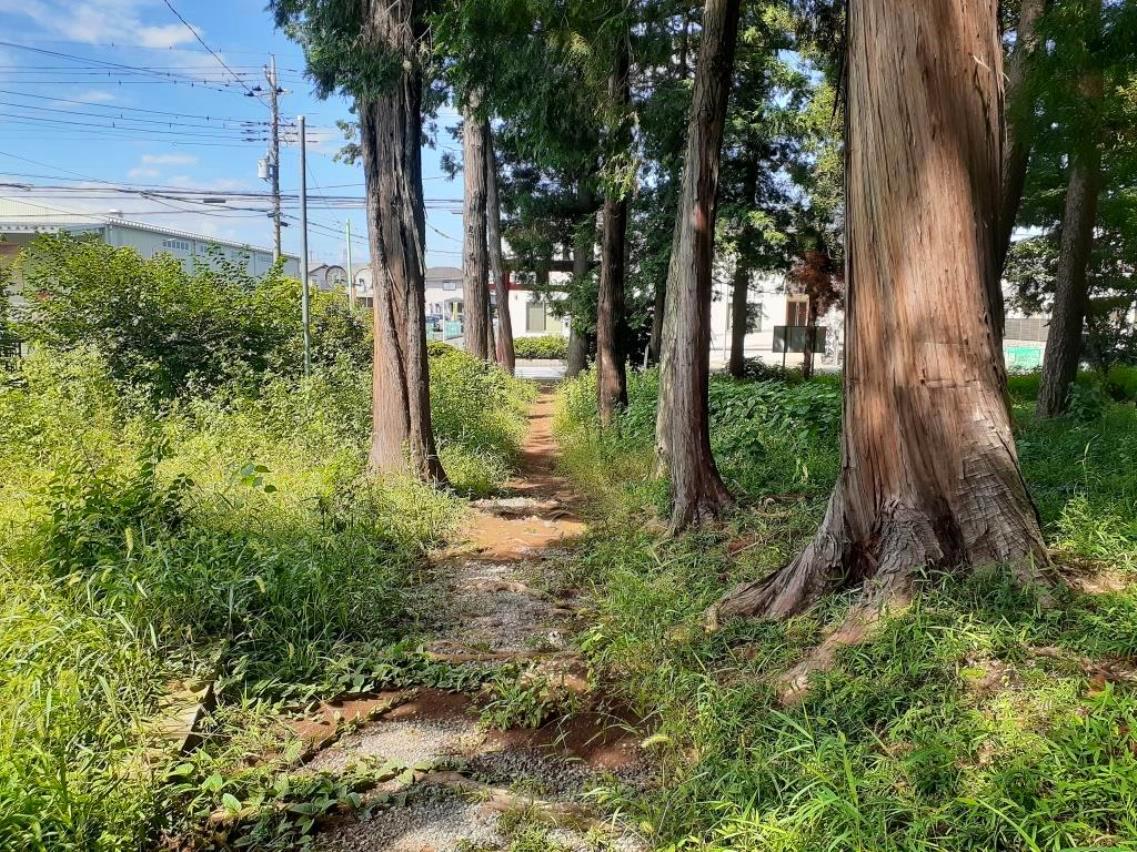 下新田、中新田、上新田を一直線に貫いている「鉄砲道」を道なりに直進し、1.1㎞程先にある「日光街道」と交わる交差点を右折する。南北に走る街道沿いには一戸建て住宅街が軒を重ねている中、350m程進むと、進行方向正面左手にこんもりとした脚折白鬚神社の社叢が見えてくる。