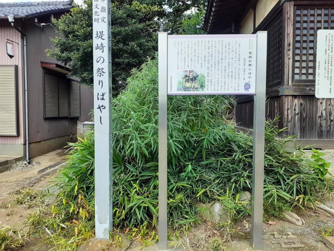 「堤崎の祭りばやし」の案内板と標柱       上尾市指定無形民俗文化財に指定