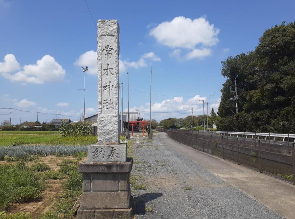 堤千方神社南方の用水路に沿って南東方向に走る道路を1.3㎞程進むと、進行方向左側で、利根川右岸の土手に「羽生スカイスポーツ公園」が見え、その公園に対して道路の反対側で、用水路に沿って常木神社は鎮座している。