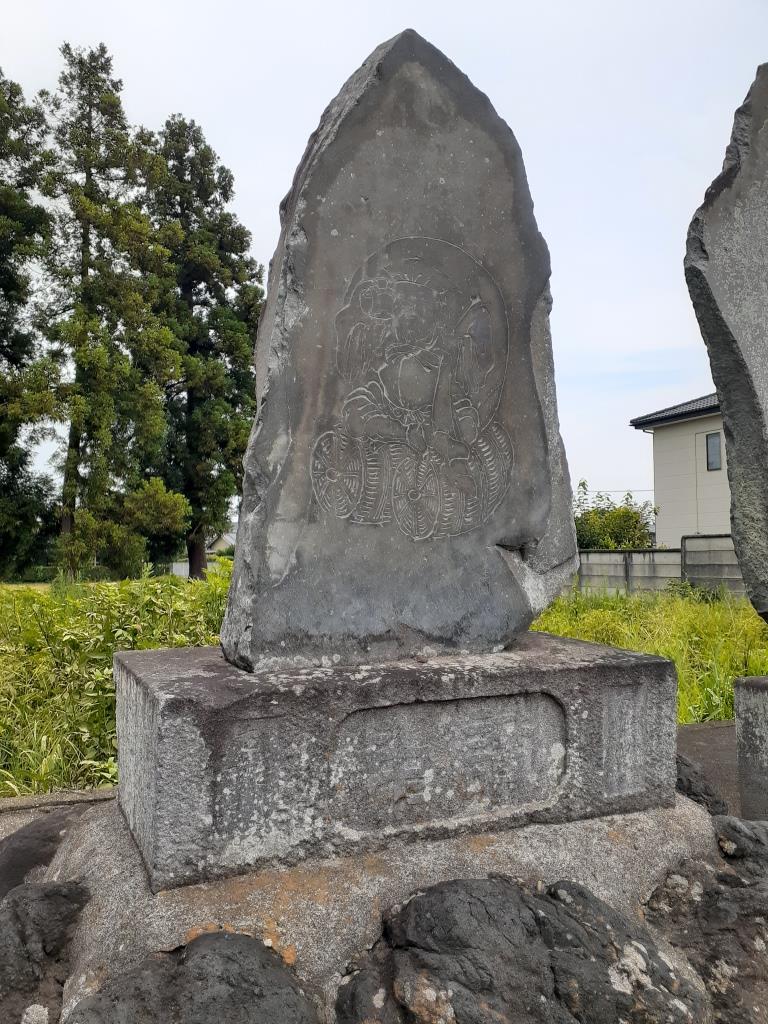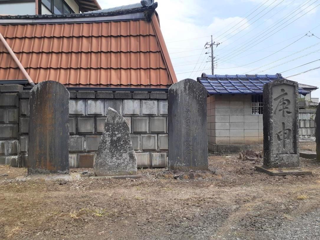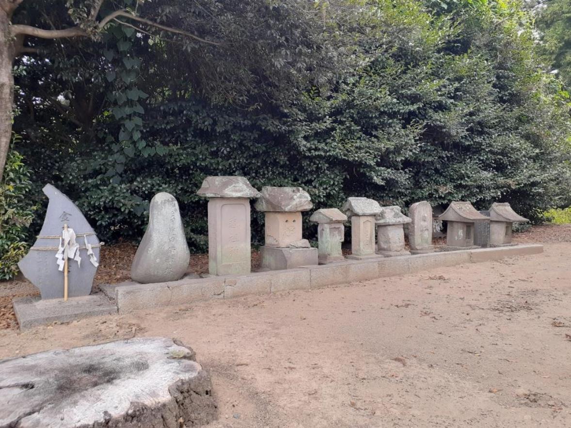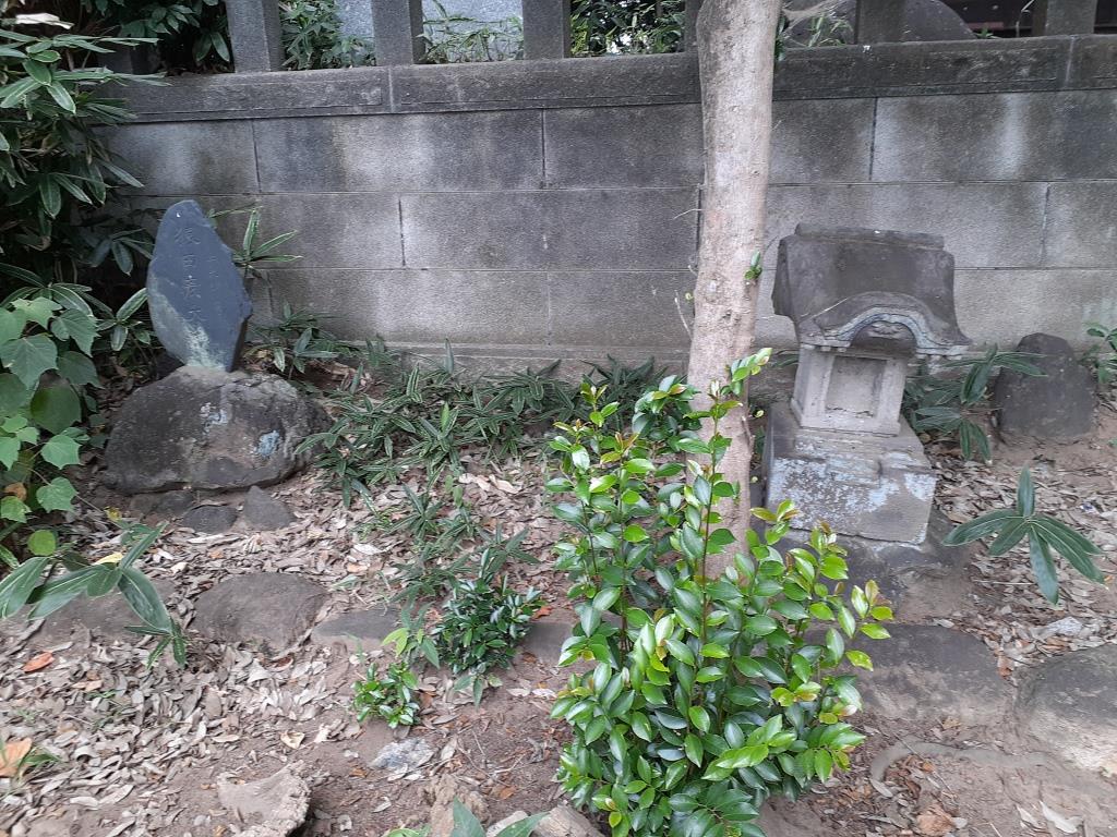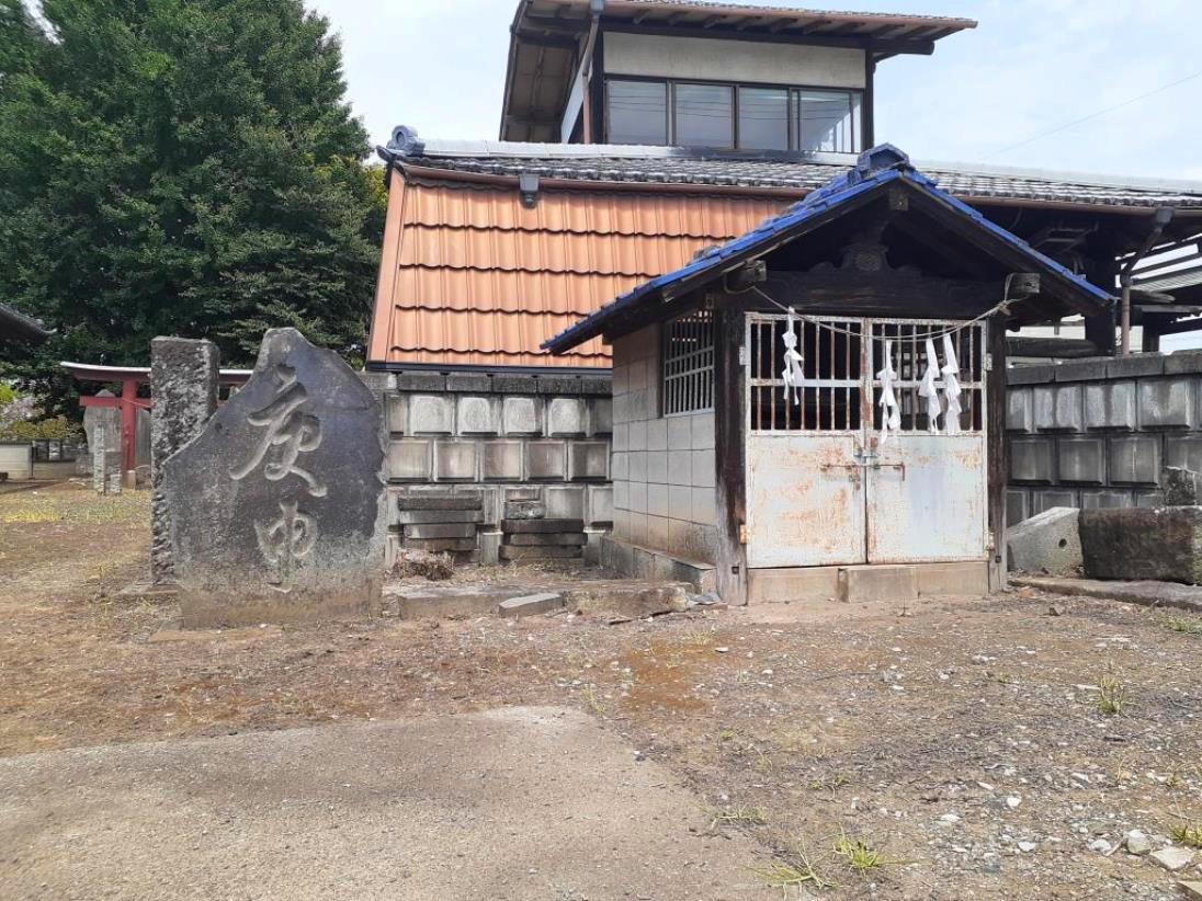 境内社・富士浅間神社の手前にある庚申塔等 道路側にも庚申塔や境内社・八坂神社が鎮座