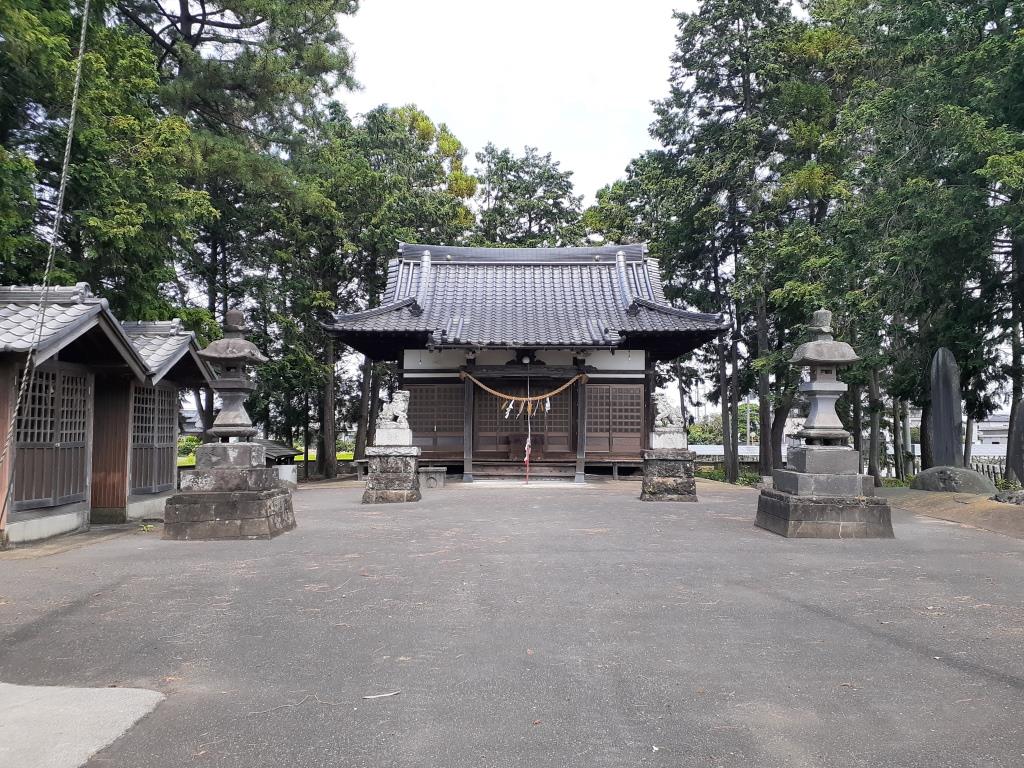 社の北側近郊には「上中森公会堂」があり、そこの駐車スペースに車を停めてから参拝を開始する。目の前には利根川の長大な堤防が、そして周囲一面田畑風景が広がる低地帯の中にポツンと静かに社は鎮座している。