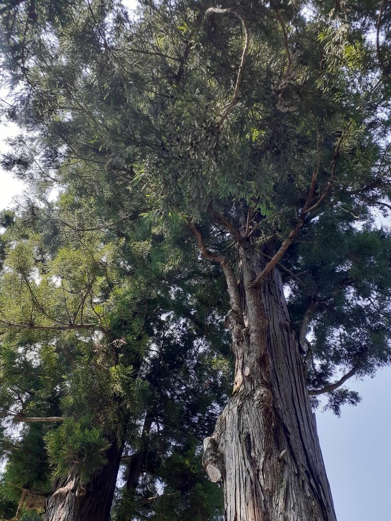 長い参道の先に、森の中に隠れた社殿が僅かに見える。