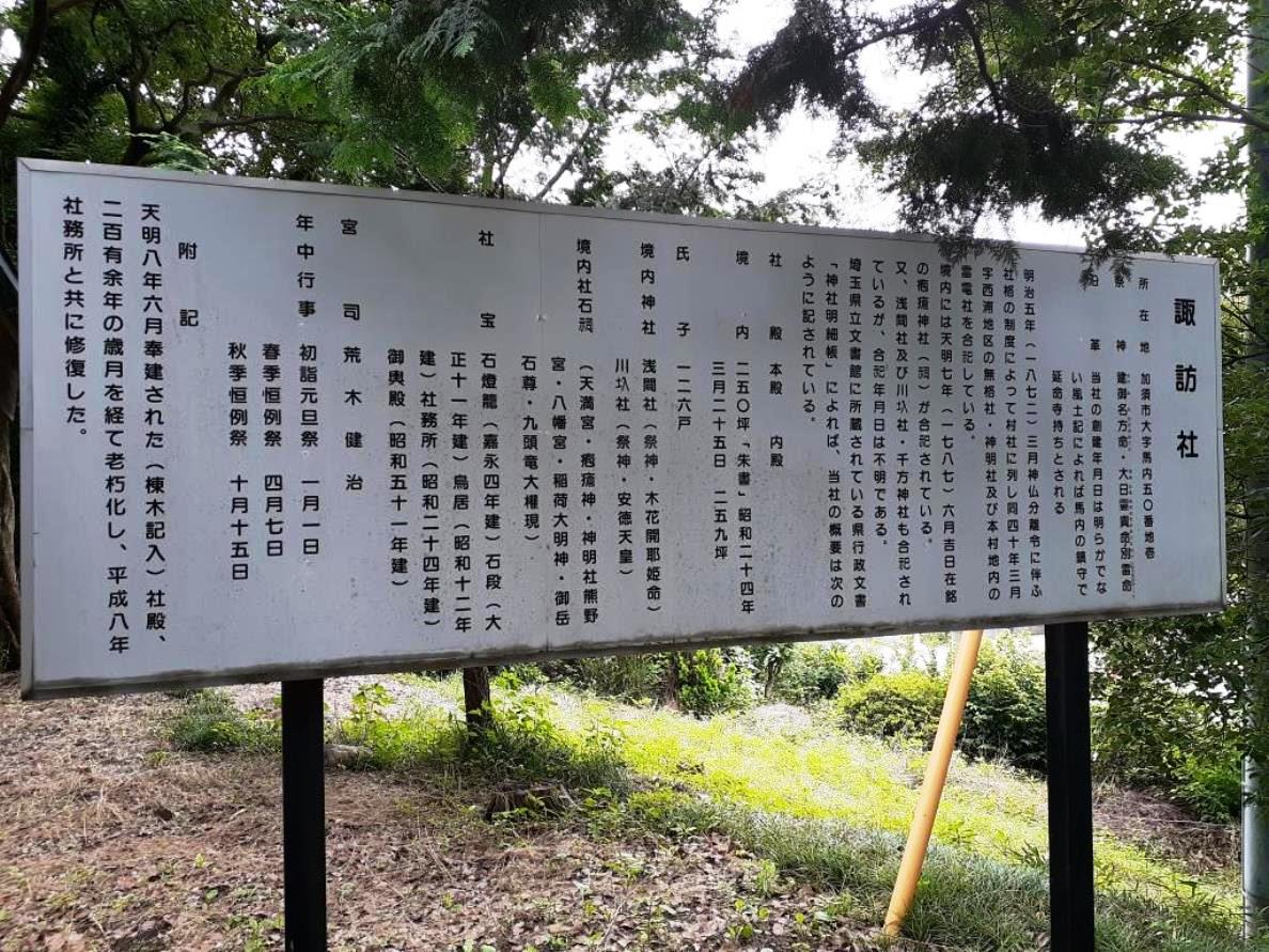 境内には御神燈、手洗い石、幟立石等の寄進や、石鳥居、神廟復地の記碑、神楽殿等々あり、手洗い石の一つは元禄十年奉納のもので、加須市内最古のものである。