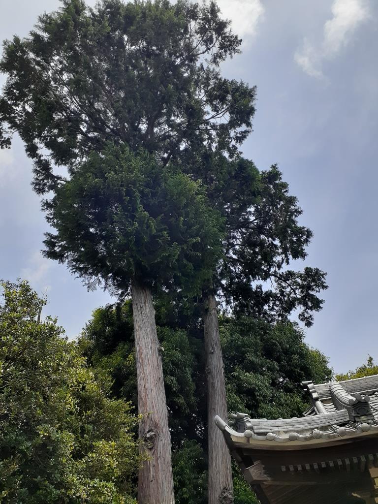 要石に隣接して聳え立つ大杉のご神木(写真左・右)