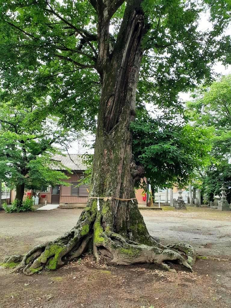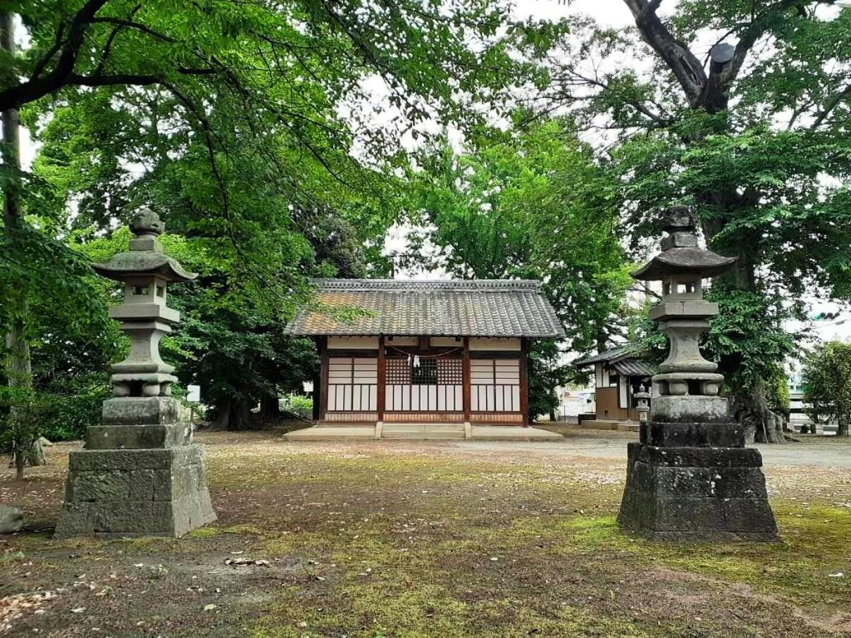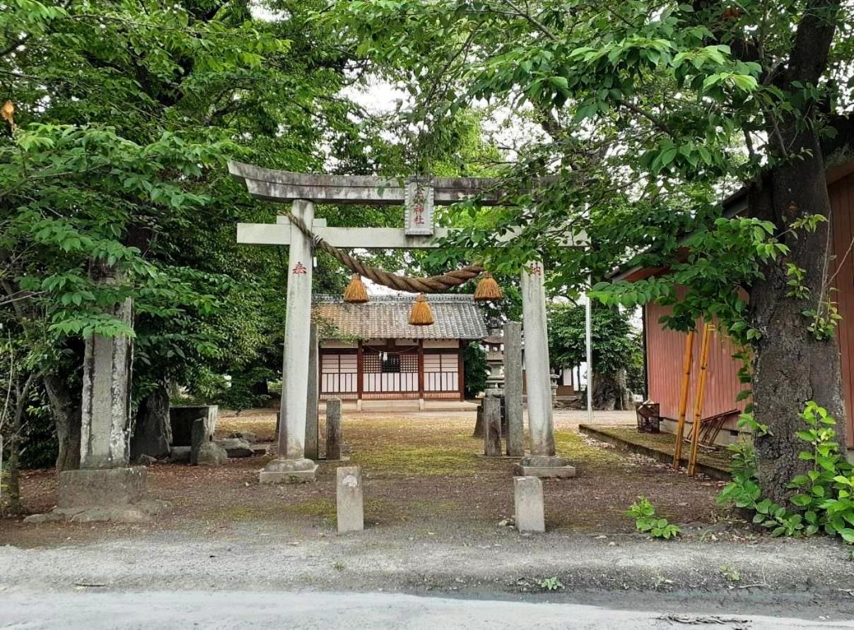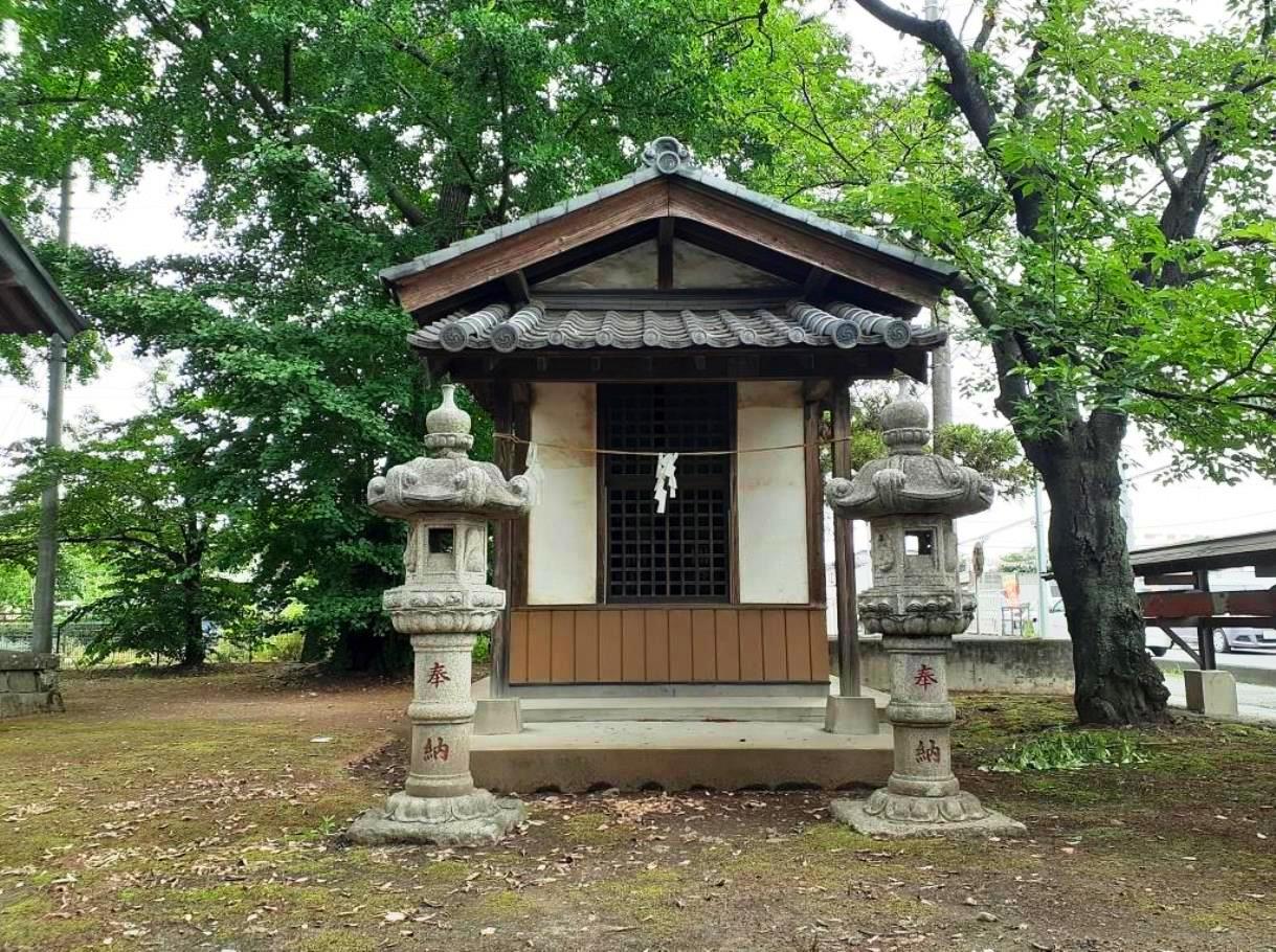 社殿右側に鎮座する境内社の中に二基の石祠があるが、向かって右側の石祠の屋根正面部に「八坂・大〇」と刻印されているようにも見える。