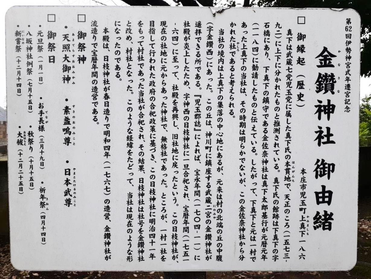 当社の境内は上真下の集落の中心地にあるが、元来は村の北端の丘の中腹(字金鑽西)にあった。この丘は、神川町に鎮座する武蔵二宮の金鑚神社が遥拝できる所である。『児玉郡誌』によれば、宝永年間(一七〇四~一一)に社殿が炎上したため、字神西の日枝神社に一旦合祀され、宝暦年間(一七五一~六四)に至って、社殿を再興し、旧社地に戻ったという。この日枝神社が、現在の社地に元からあった神社で、無格社であった。ところが、一村一社を目指して行われた政府の合祀政策に基づき、この日枝神社に明治四十一年をもって村社であった当社が合祀され、その結果、日枝神社は社号を金鑚神社と改め、村社となった。このような経緯をたどって、当社は現在のような形になったのである。