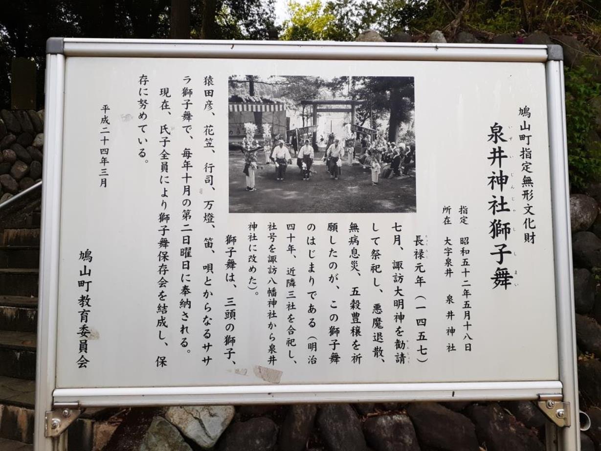 石段を挟んだ反対側には、鳩山町指定無形文化財である「泉井神社獅子舞」の案内板がある。