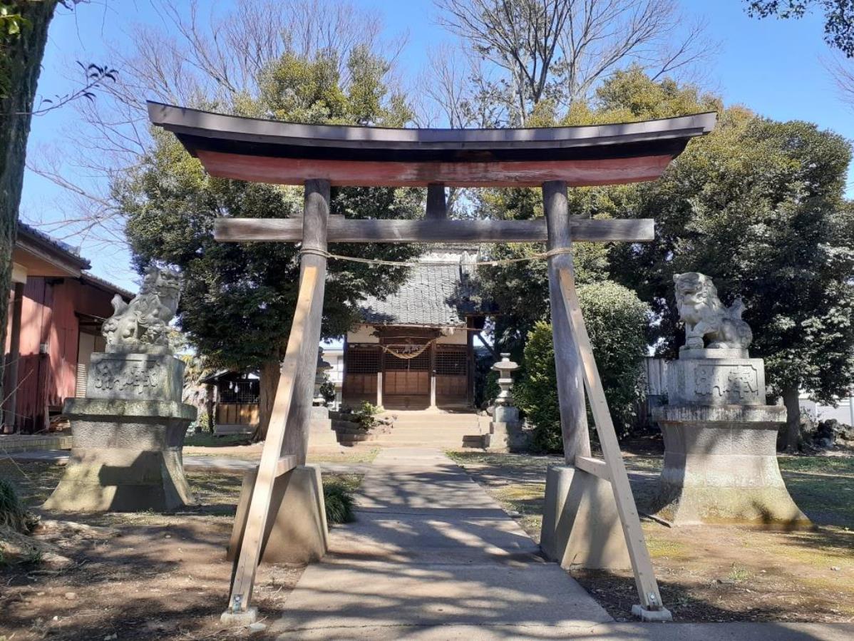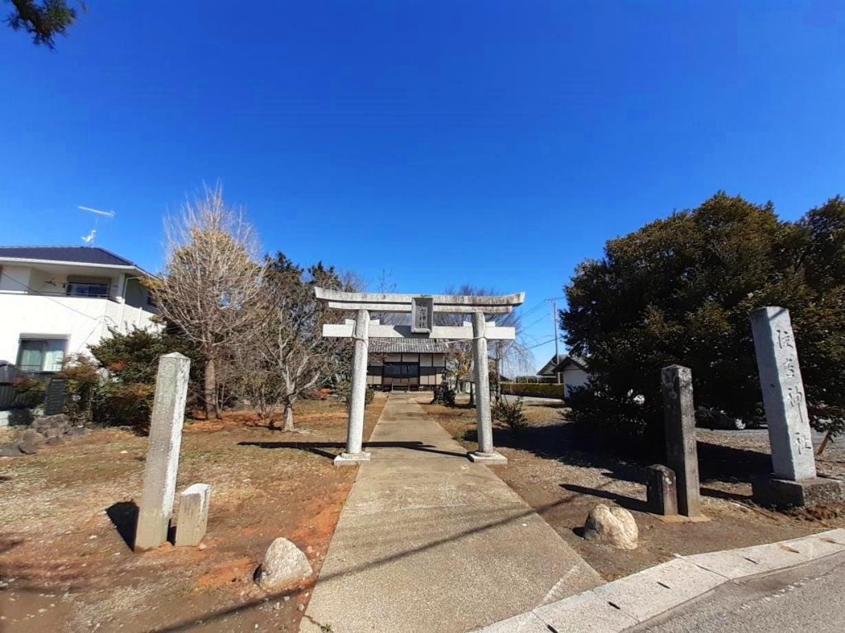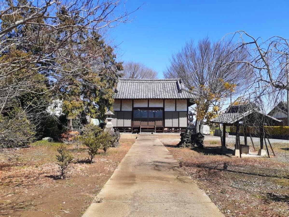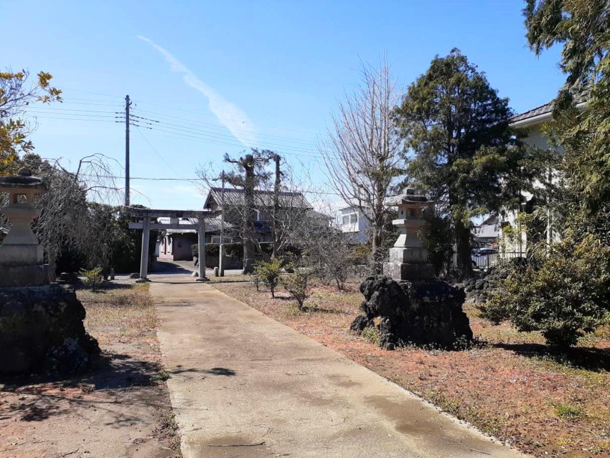 周囲は一面に広がる田畑風景の中に民家が数件固まって存在する閑静な地。北方向に伸びる道がY字路となるその扇型に広がる内包部に社がおさまっているような印象で、まるで左右に広がる道路が俗世間と一線を画すような結界にも見えてくるから不思議だ。