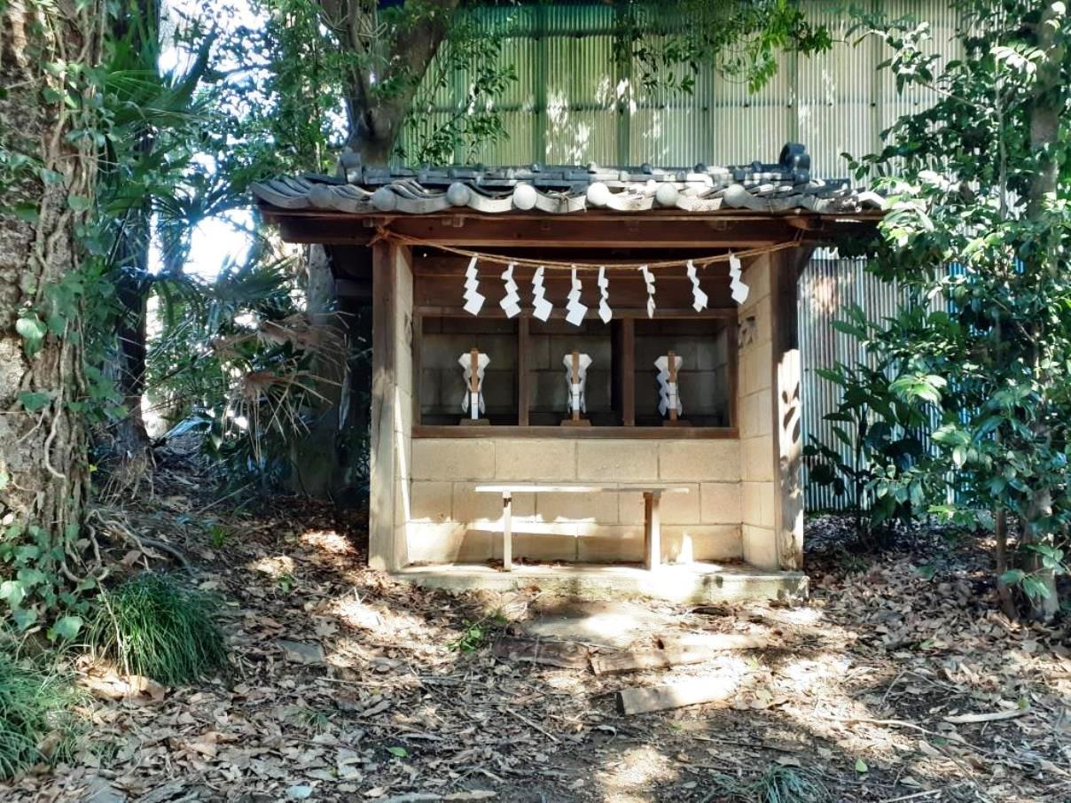 社殿左隣に祀られている境内社・八坂神社 社殿右側には庚申塔や大黒天等が並んでいる。
