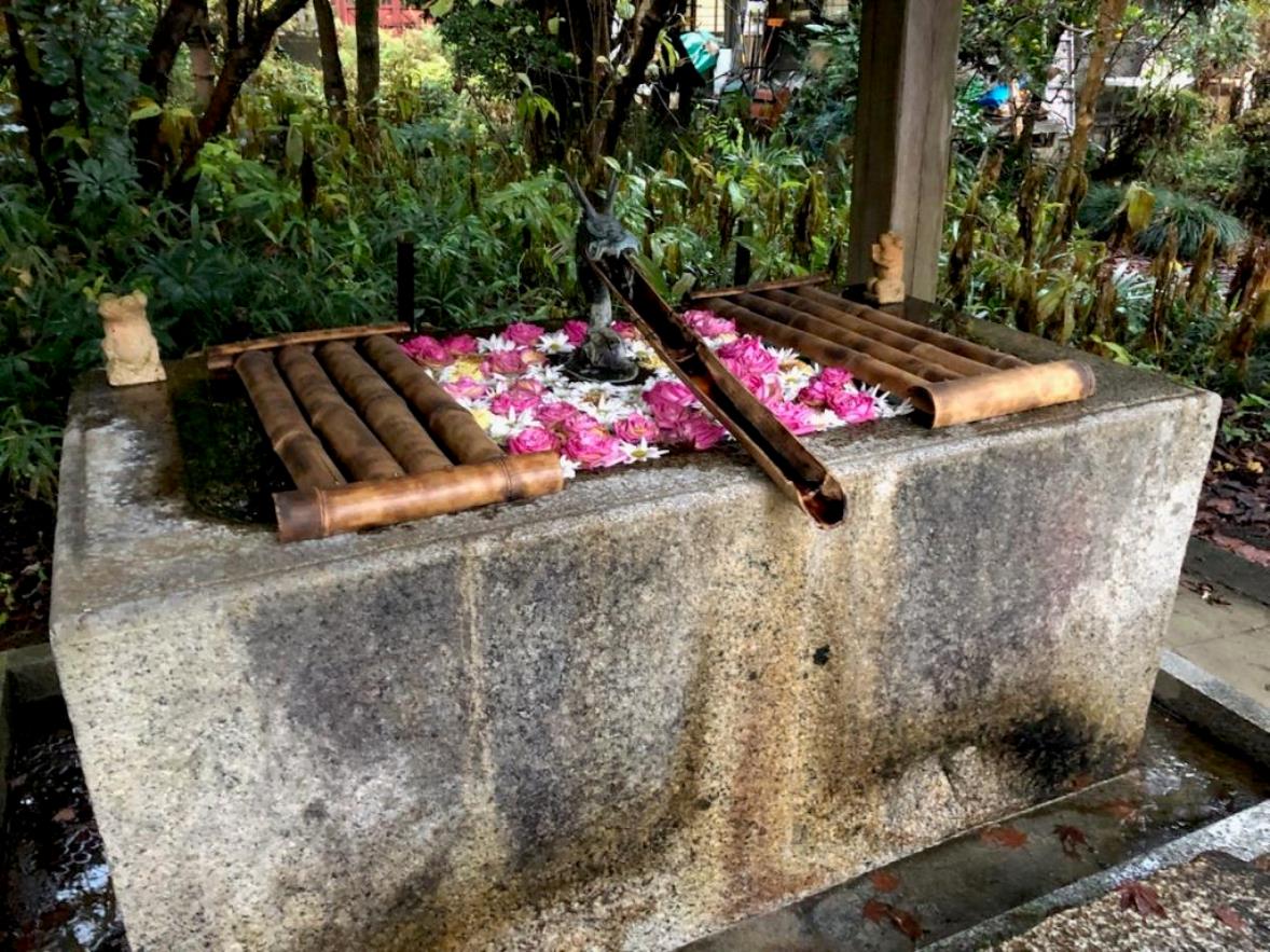 正面鳥居を過ぎ、すぐ参道左手に神楽殿がある。 神楽殿の並びにある手水舎。