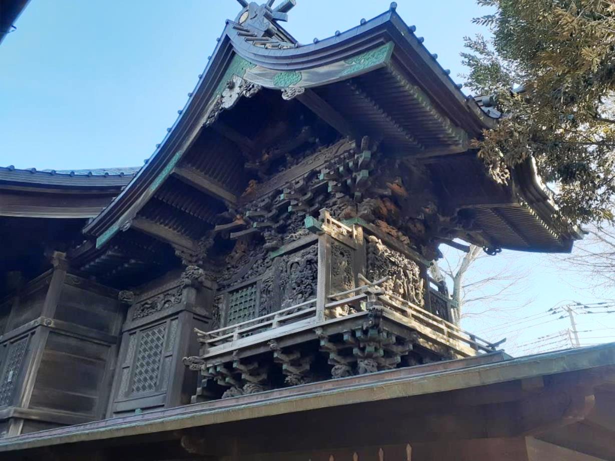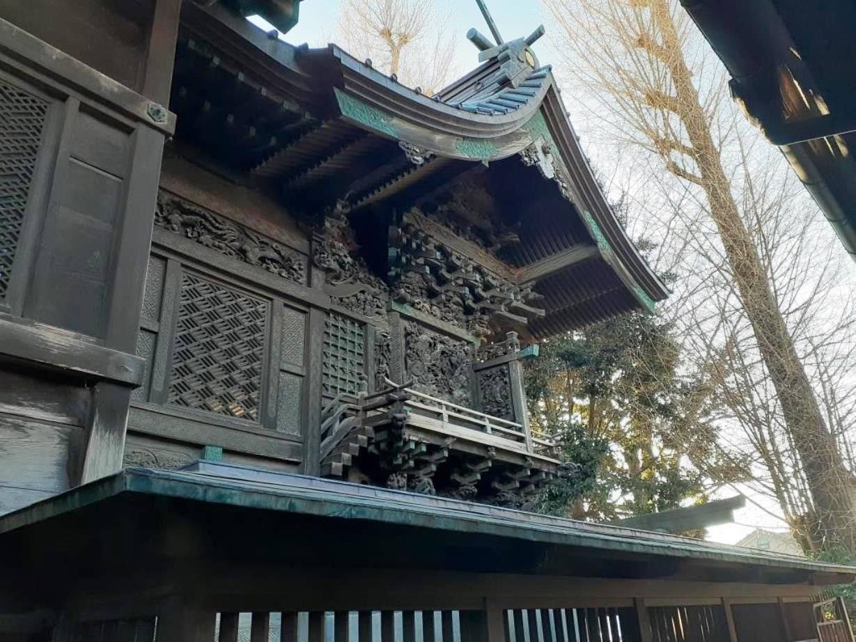 伊勢崎神社の本殿は江戸時代後期の嘉永元年(1848)に再建されたもので、一間社、流造り、銅板葺き、建物全体に精巧な彫刻が施され特に壁面には中国の故事と思われる透かし彫りが見られる。因みに拝殿は木造平屋建て、入母屋、銅瓦棒葺き、正面千鳥破風、平入、桁行5間、正面1間軒唐破風向拝付き、外壁は真壁造り横板張り。幣殿は両下造(本殿と拝殿を切妻屋根で接続)、銅瓦棒葺、桁行1間、張間1間。