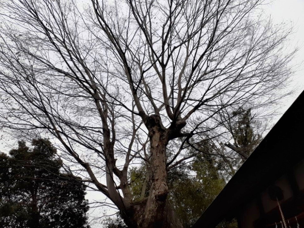 規模が大きな社でないにも関わらず、社殿近くに聳え立つご神木である大欅(ケヤキ)の存在は、まさに圧巻である(写真左・右)。主幹は既に無くなっており、更には裏に回ると、根本日斤から大きく空洞化している。主幹から伸びている1本の大枝や、数本の細枝は元気な様子だが、既に全盛期は越えてしまっているのが、実見しただけであるがそれでも分かる状況だ。