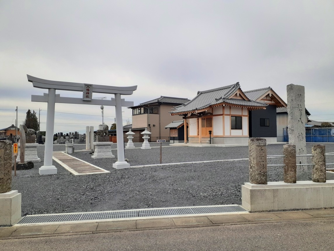 参道の両側には幾多の石碑、石神が設置されている。その中には利根川堤防拡張のために現在地に移設した「八幡神社新築記念碑」(写真左)があり、つい最近に移設したようだ。また記念碑の向かい側には「諏訪大神」と刻まれた石祠もある。(同右・真ん中の石碑)。