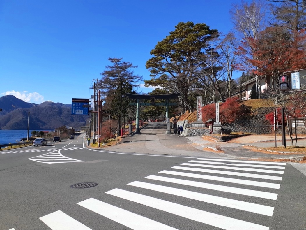中禅寺湖の美しさに暫し参拝を見合わせる。 鳥居の右手には社号標があり、その奥に