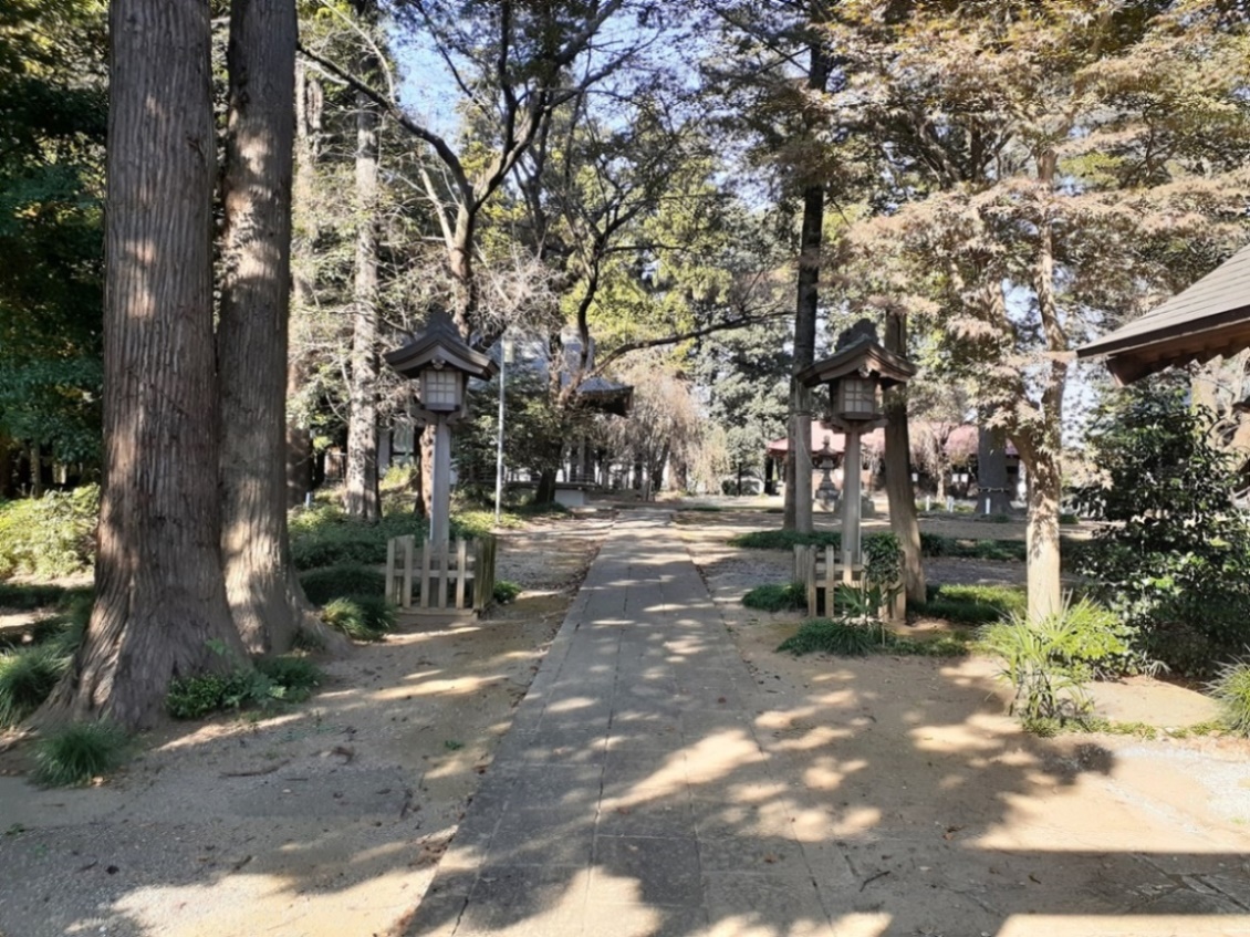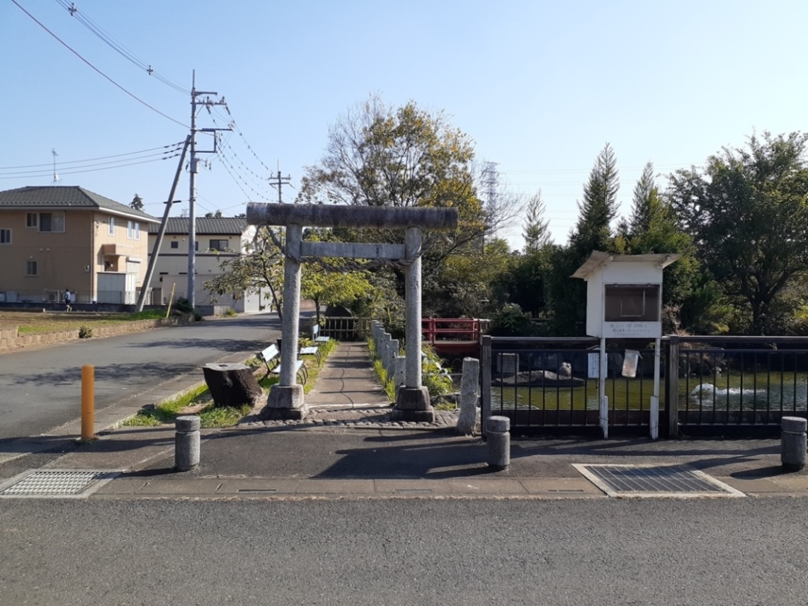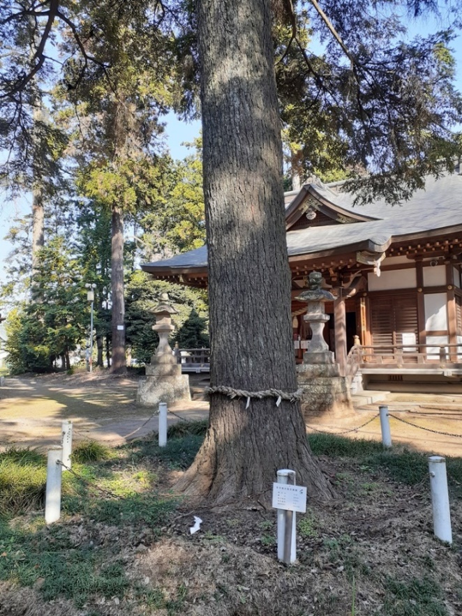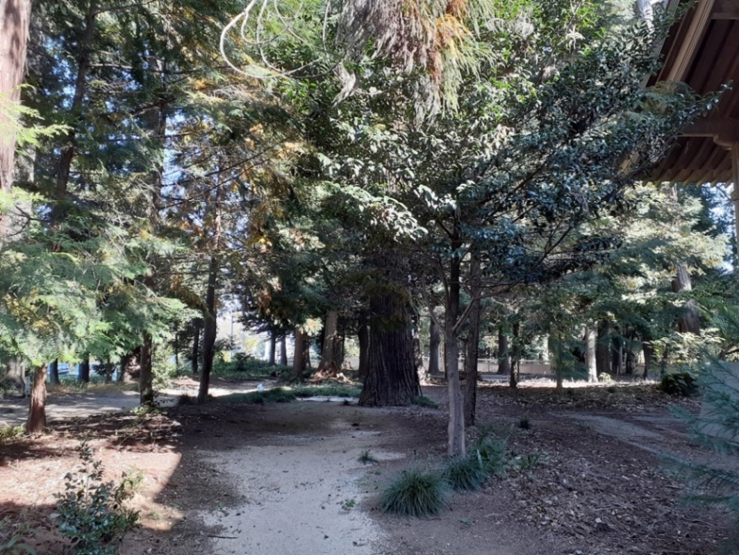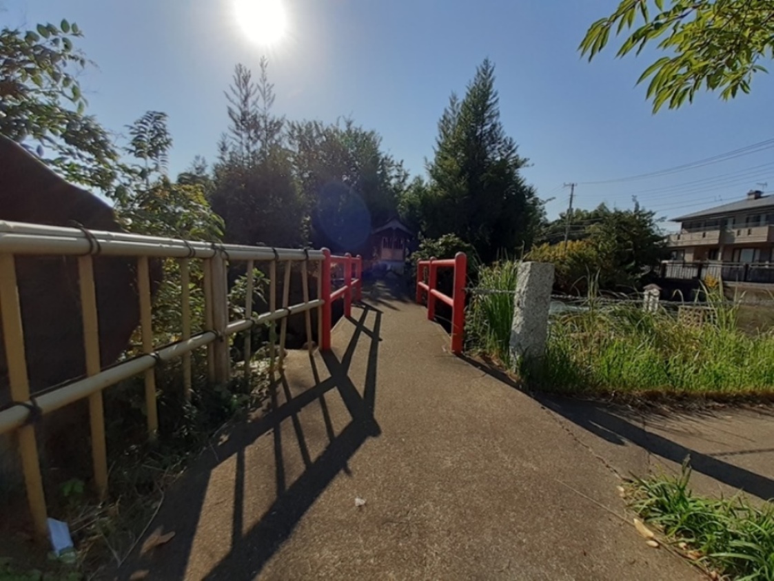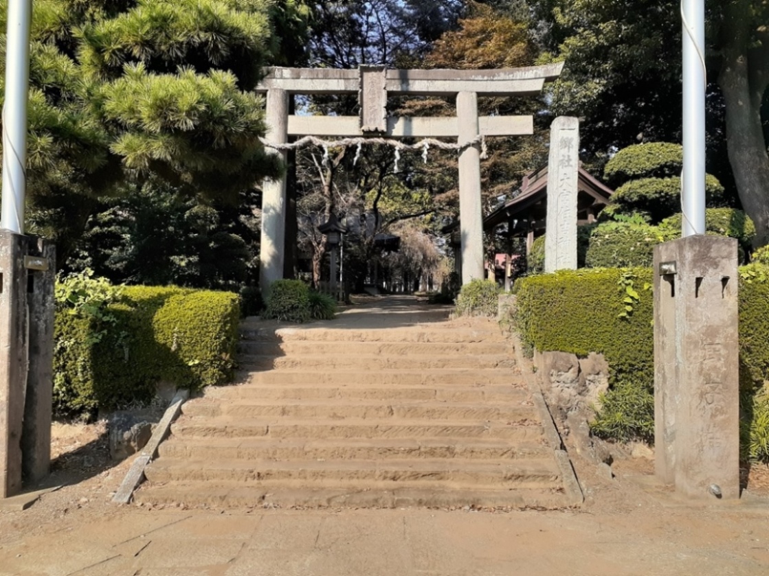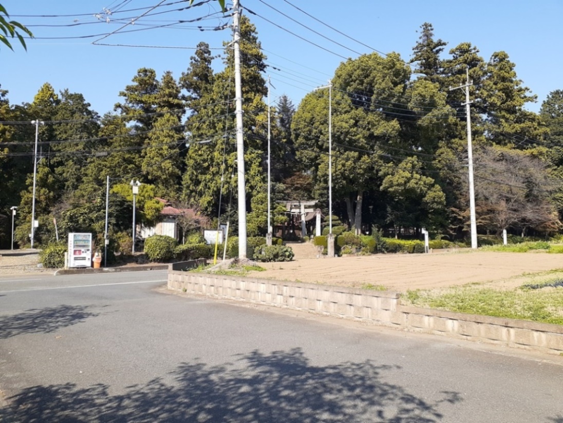 正面に立つ鳥居と社の境内北側に隣接する「坂戸市消防団大家分団第3部」との間に境内に通じる舗装されていない道があり、そこに移動し、撮影等に支障にない場所に車を停めてから参拝を開始した。