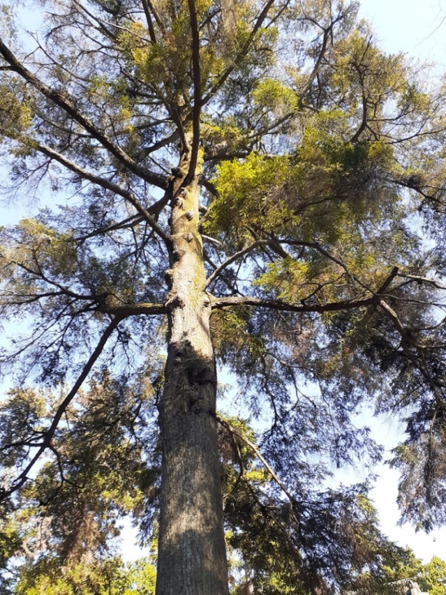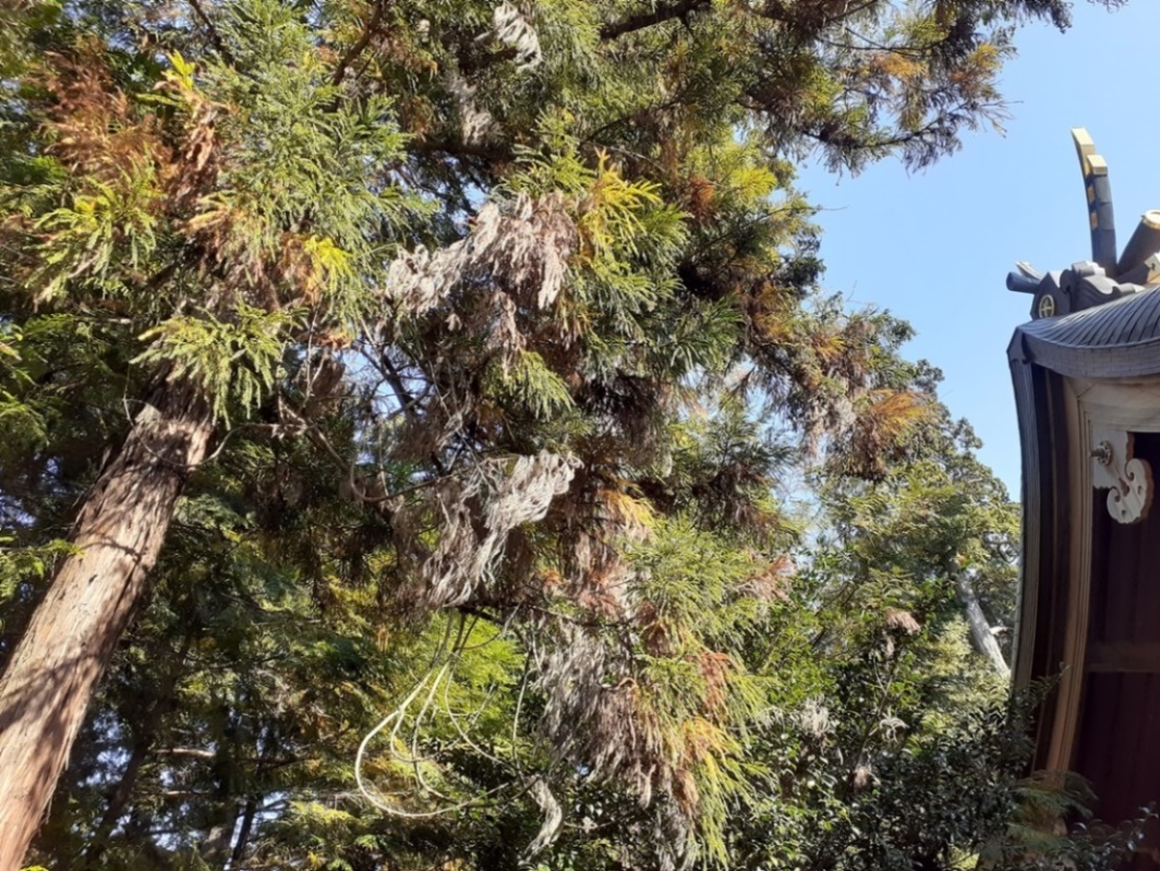 参道を進むと正面右側にご神木が孤高に聳え立つ(写真左・右)