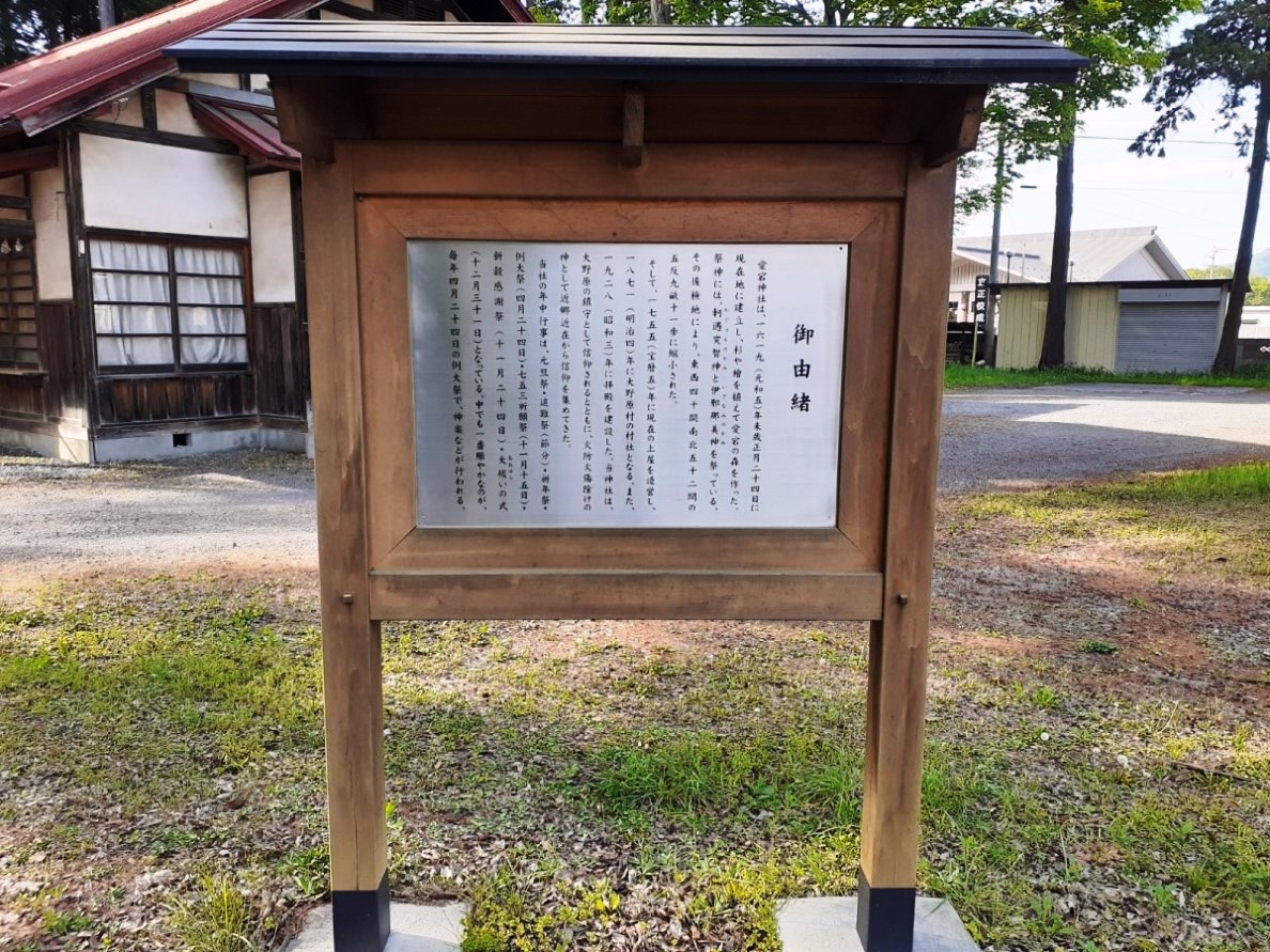 昭和三六年(一九六一)再建の棟札には、天正五年(一五七七)・享保六年(一七二一)・宝暦十二年(一七六二)・安永二年(一七七三)・天明六年(一七八六)・文化三年(一八〇六)の本殿造営及び屋根葺き替えの棟札の写しが記されており、造営の足跡を知ることができる。