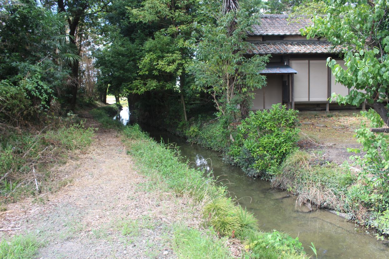 社の東側には真っすぐに越辺川の土手が続く。