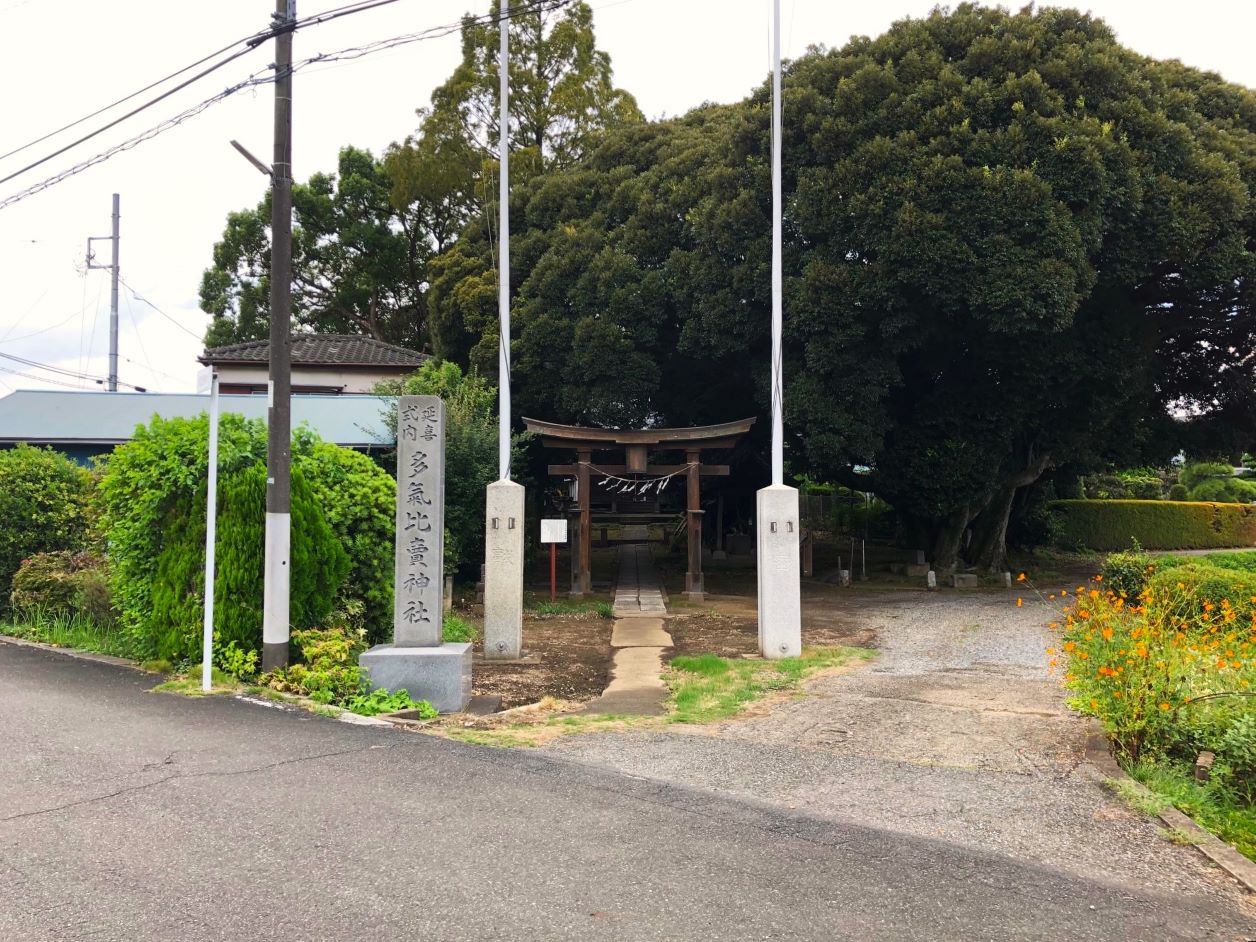 筆者が居住する熊谷市から国道17号線を南下し、桶川市「坂田」の交差点で菖蒲方面に左折する。埼玉県道12号川越栗橋線合流後2.5km先の「東武工業団地入り口」の信号を越えて、赤堀川に架かる「加納橋」を渡ったすぐ先の道を左折して、しばらく河川沿いに進むと正面に篠津多氣比賣神社の社叢林、及び正面鳥居が見えてくる。