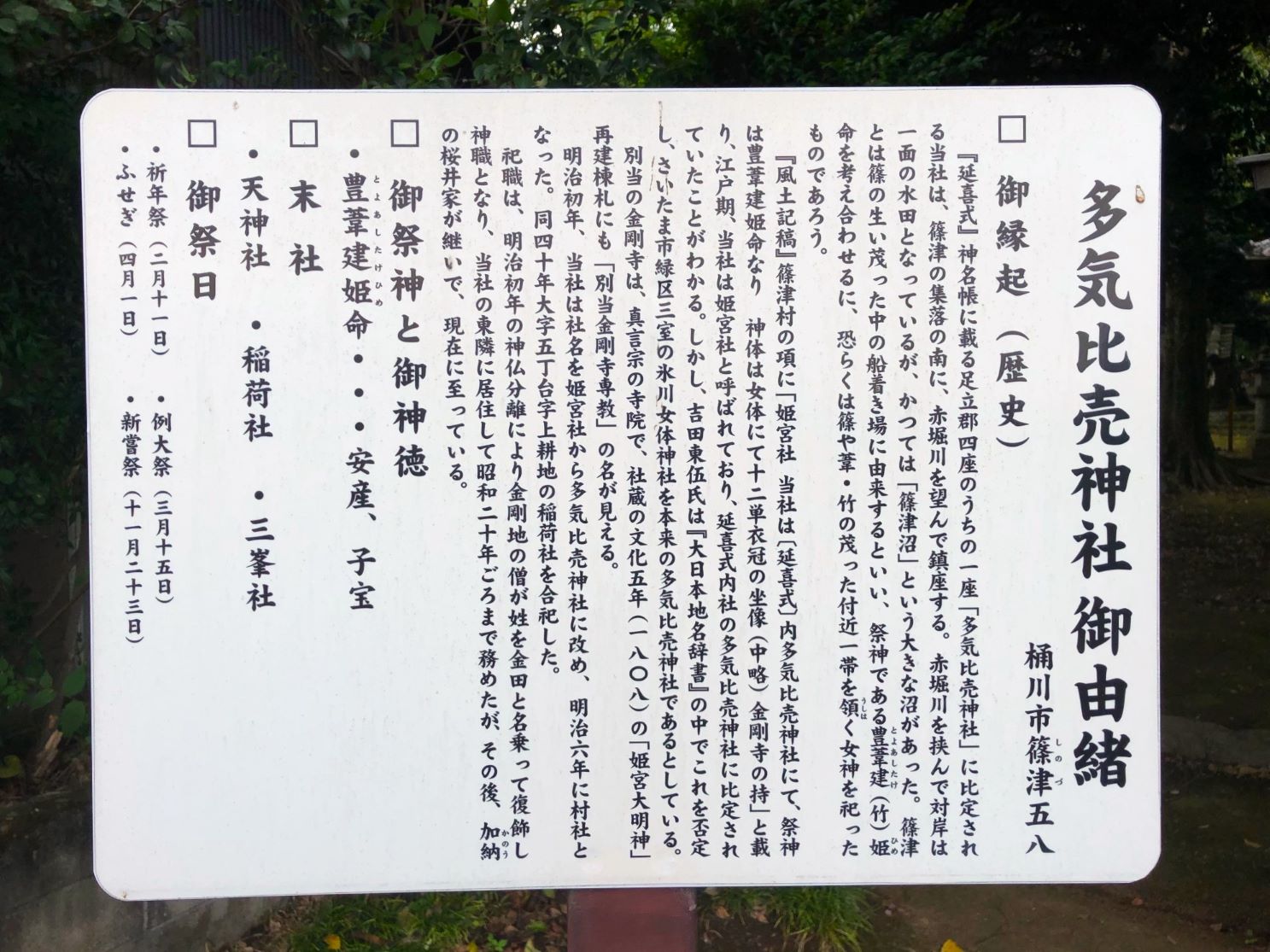 ところで当社が鎮座する篠津の「篠」は竹、「津」は船着き場を意味し、かつて同地には篠津沼という大きな沼があった。田園が広がる地域ということもあり、稲を神格化した女神を祀ったといい説と、「多気」を「建・武・猛」の意とすれば元荒川の氾濫をその神の御性格と見て、たけり狂う神、たけだけしい神として「建比売」をこの地に奉祭したものとする説がある。